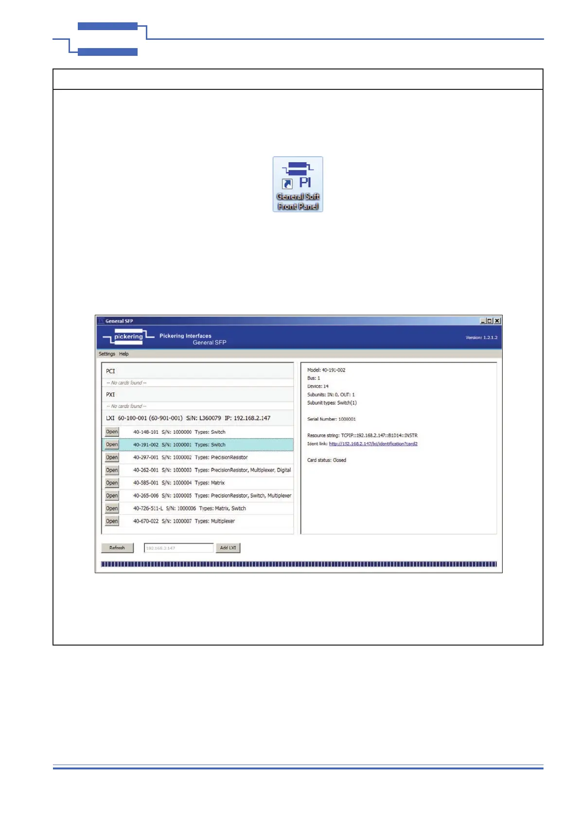 A selector panel will appear, listing all installed Pickering PCI, PXI or LXI switch cards and resistor cards. Click