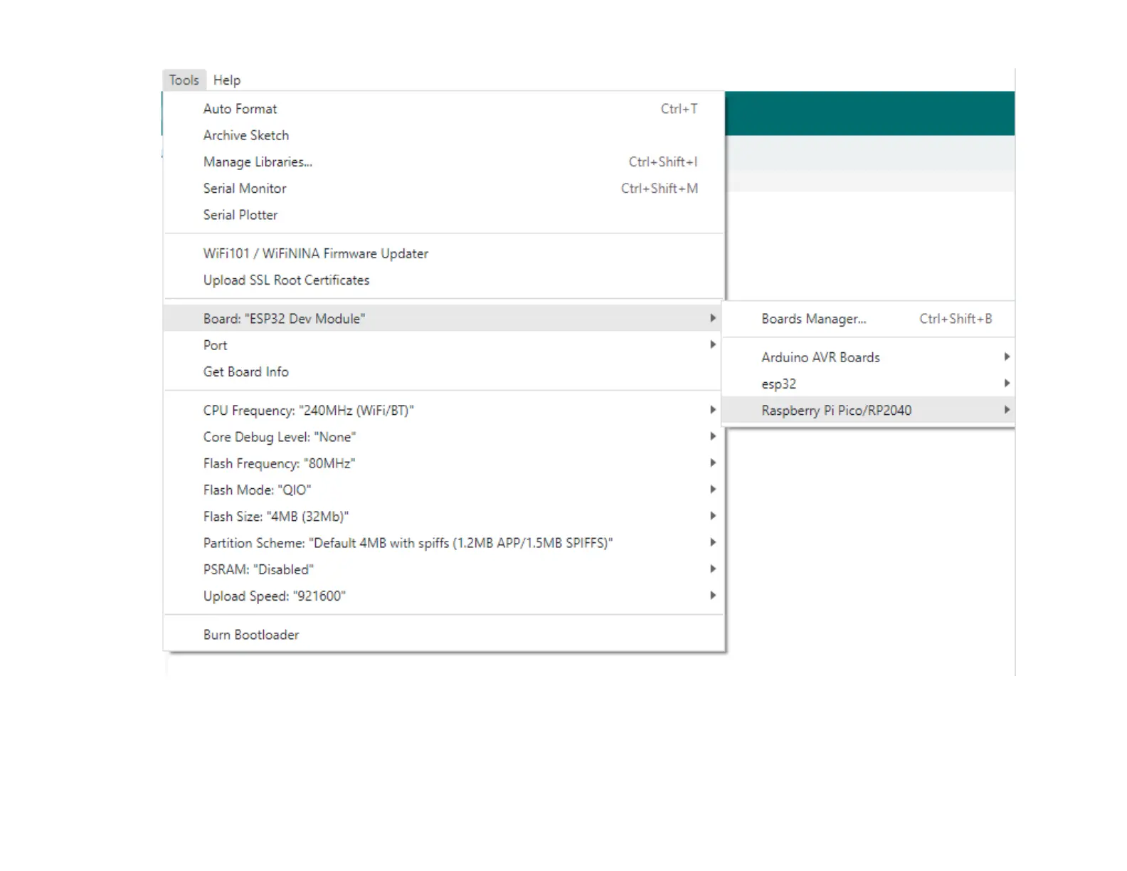 5. Click Tool -> Dev Board -> Raspberry Pi Pico/RP2040 -> Raspberry Pi Pico.