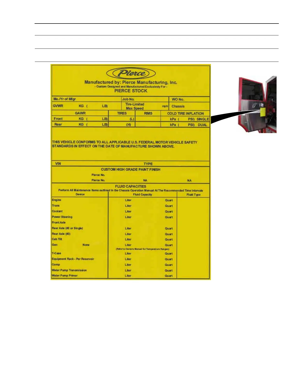 Vehicle Safety Standard (FMVSS) information decal found in the driver’s side of the cab.