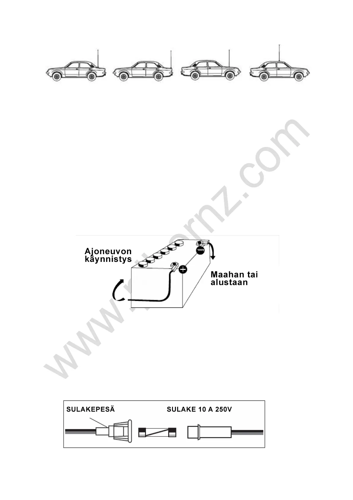 Tässä lähetin-vastaanottimessa on 10 A, 250 V sulake.