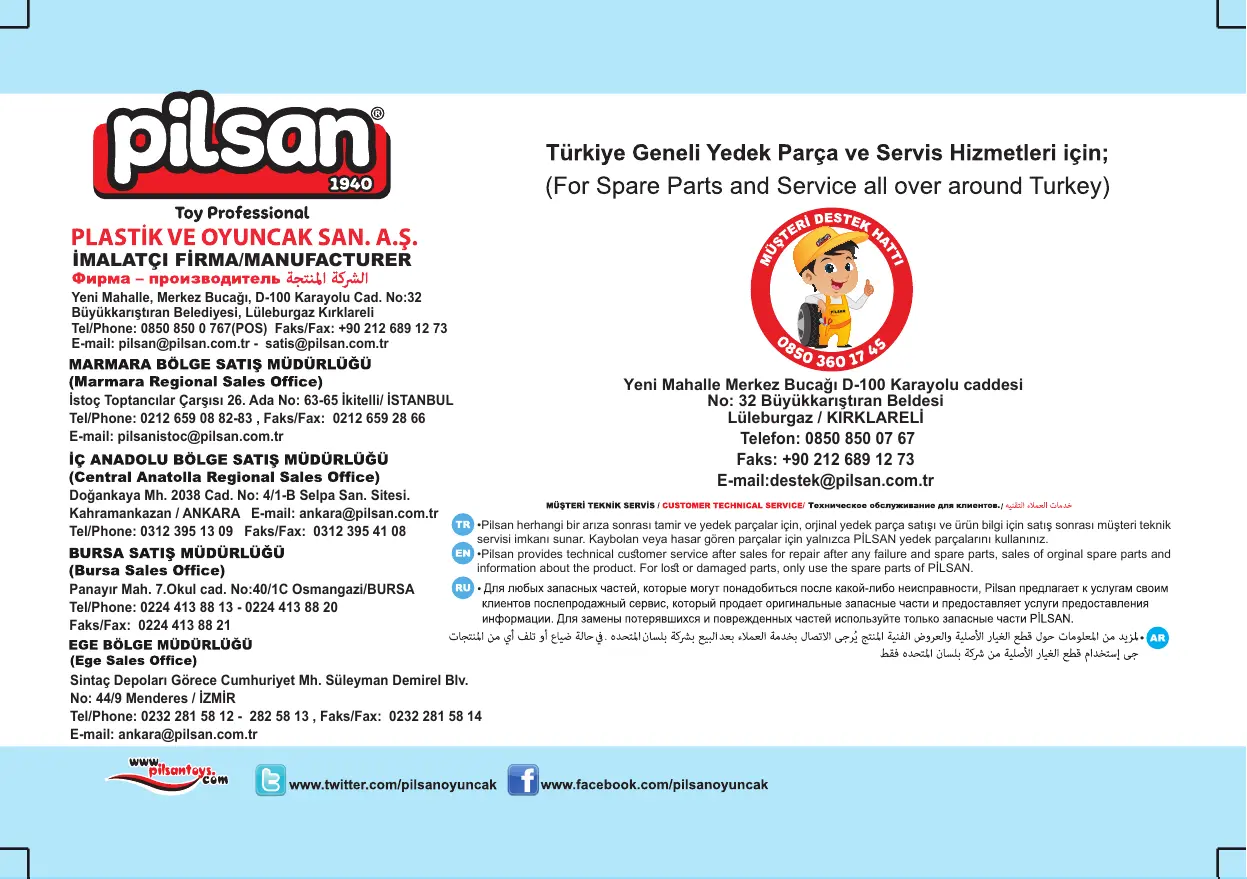 •Pilsan herhangi bir arıza sonrası tamir ve yedek parçalar için, orjinal yedek parça satışı ve ürün bilgi için satış sonrası müşteri teknik