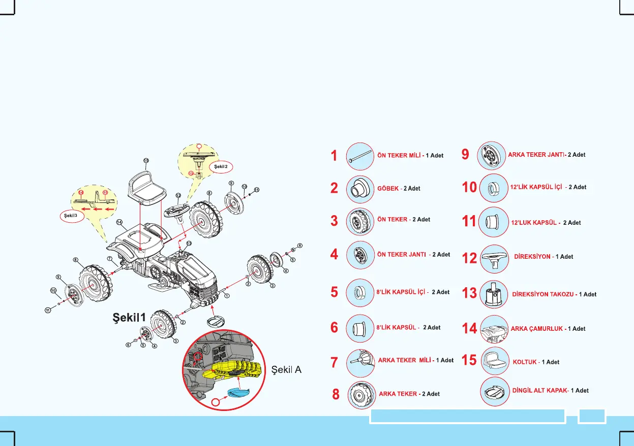 3) Arka Tekerin Montajı: (7’nolu) arka teker miline , (8’nolu) arka teker (9’nolu) arka teker jantını (şekil 1’deki gibi) sırasıyla takınız ve (10 ’nolu) 12’lik kapsül içini mildeki yuvasına oturtup. (11’nolu)