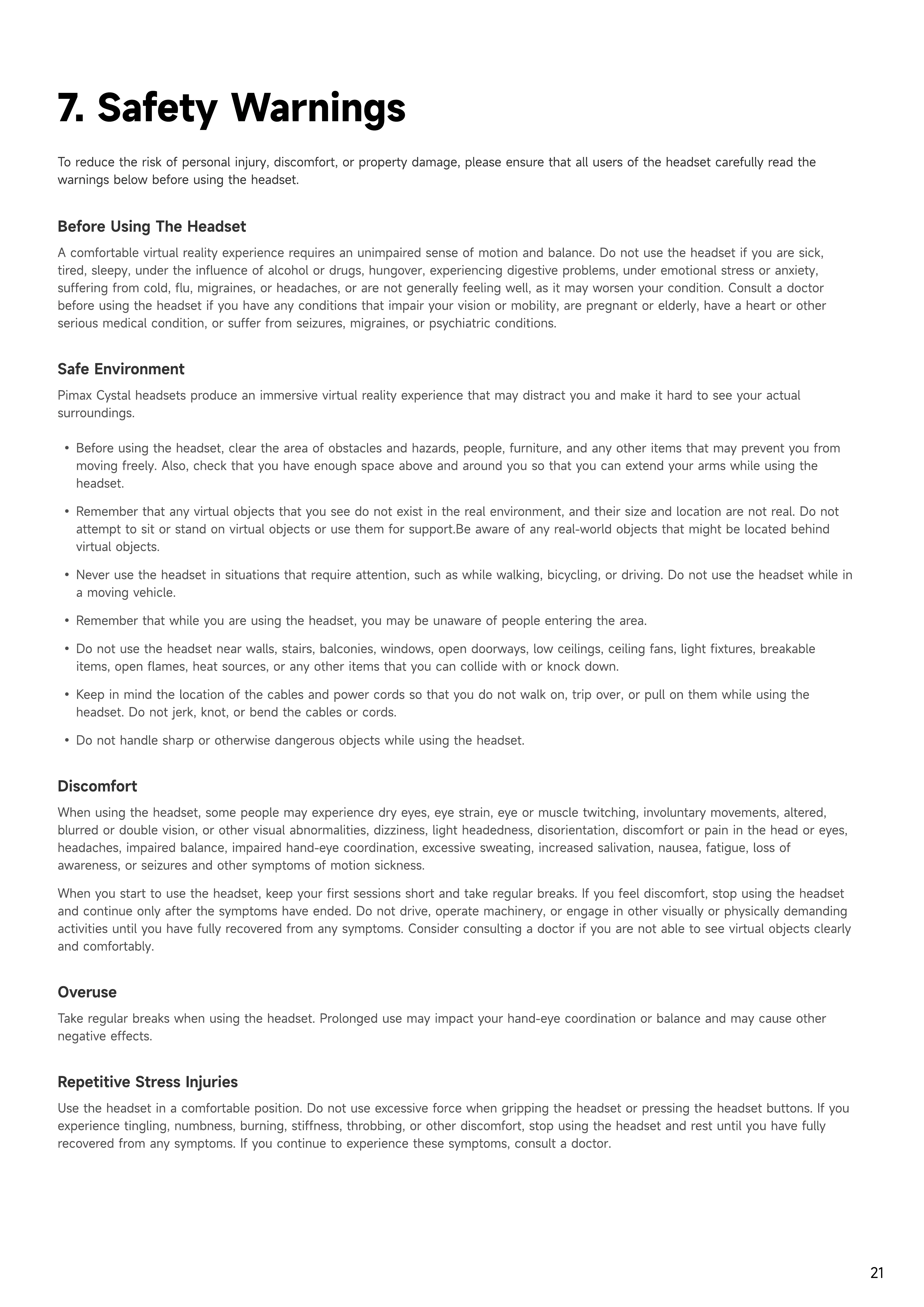 before using the headset if you have any conditions that impair your vision or mobility, are pregnant or elderly, have a heart or other