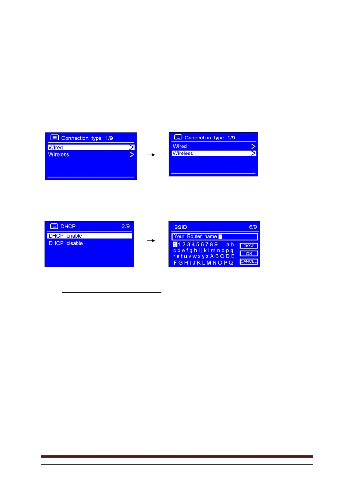 2. With the arrow pointing to DHCP enable, press SELECT to confirm and go through the wireless