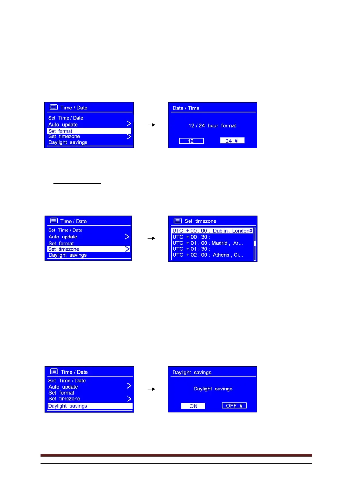 1. Rotate the knob or use the arrow keys to highlight Set time zone. Press to confirm.