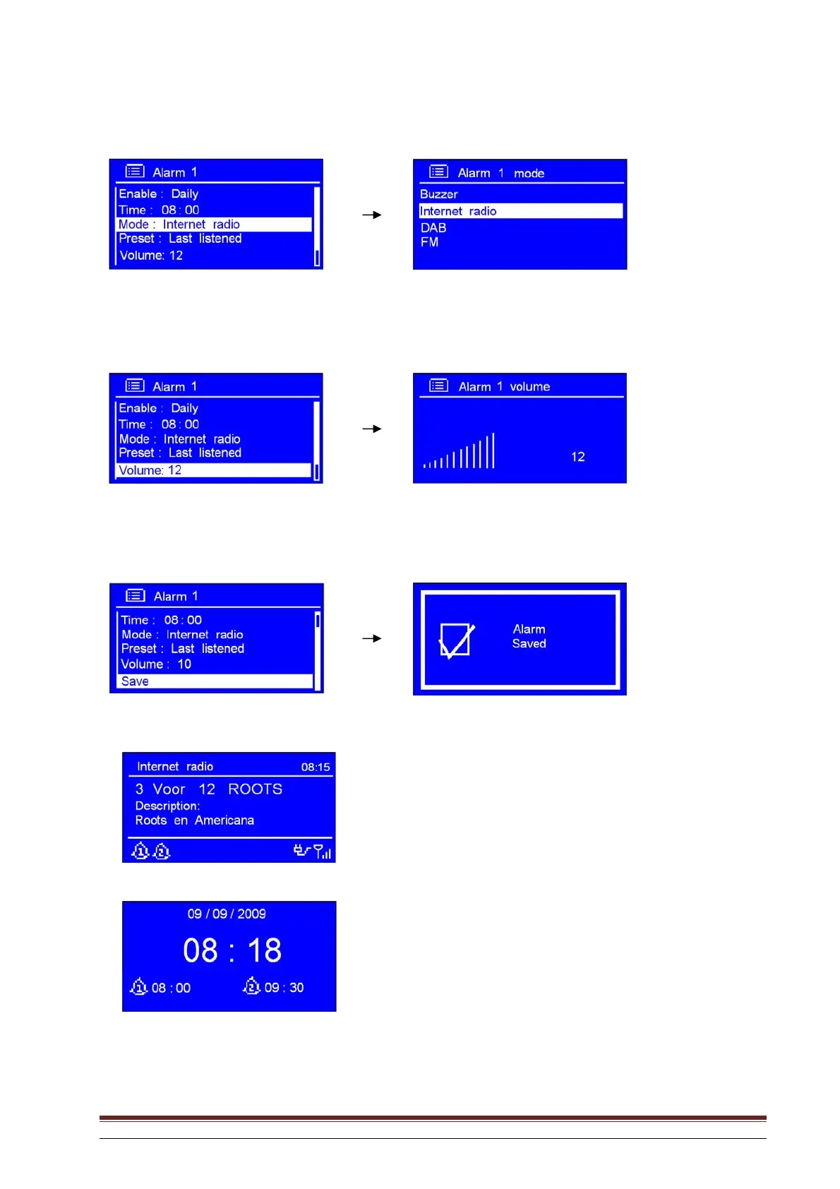 The display shows Alarm Saved for three seconds. The alarm icon is displayed.