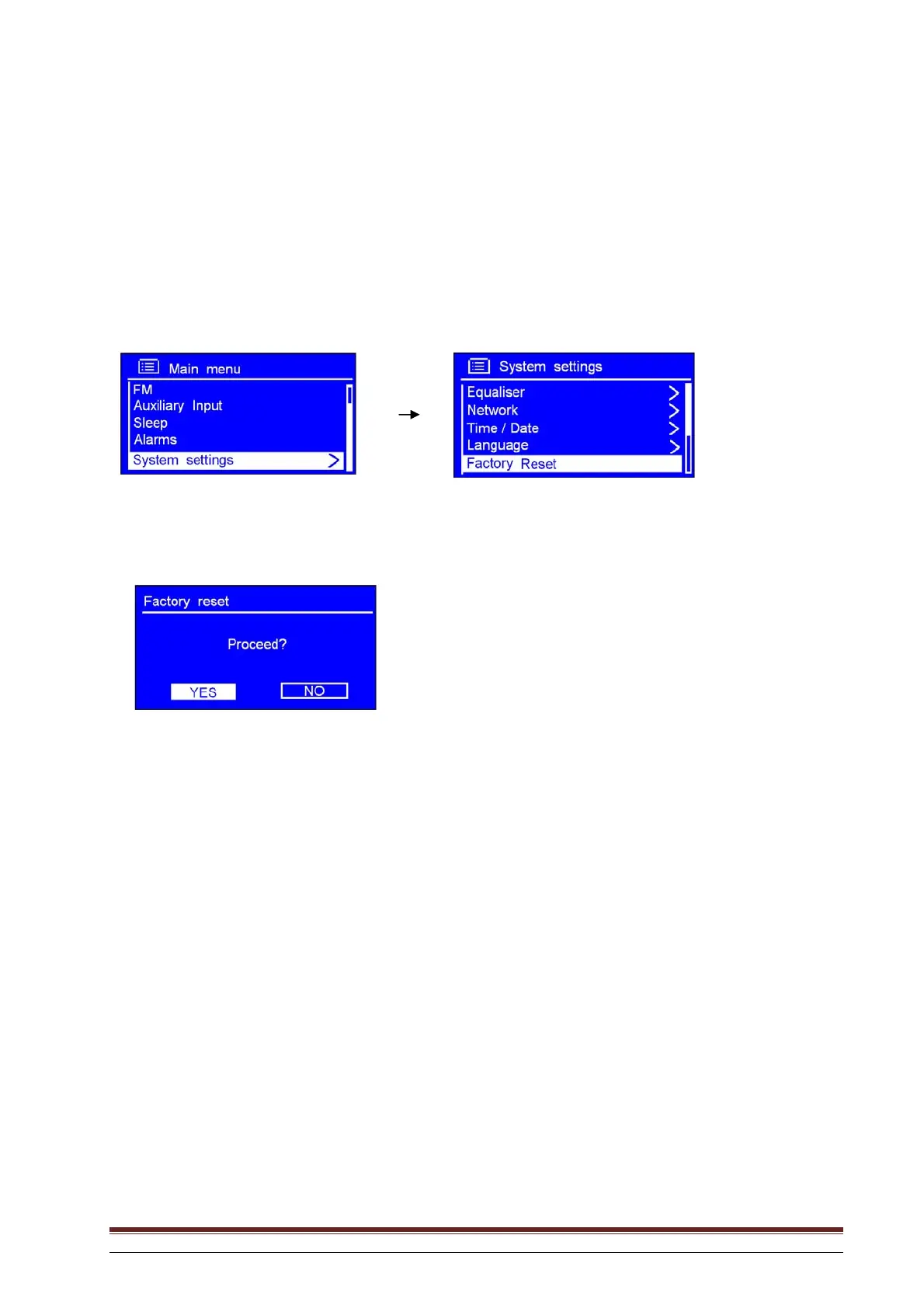 1. This may be activated from Main menu System settings Factory reset.