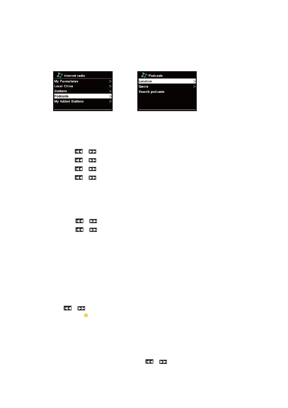 1. Press MENU button - Station list - Podcasts, press SELECT to confirm.