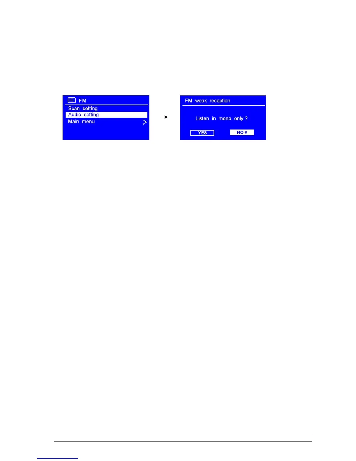 1. FM mode, at any step by pressing BACK or MENU to enter it’s setting mode