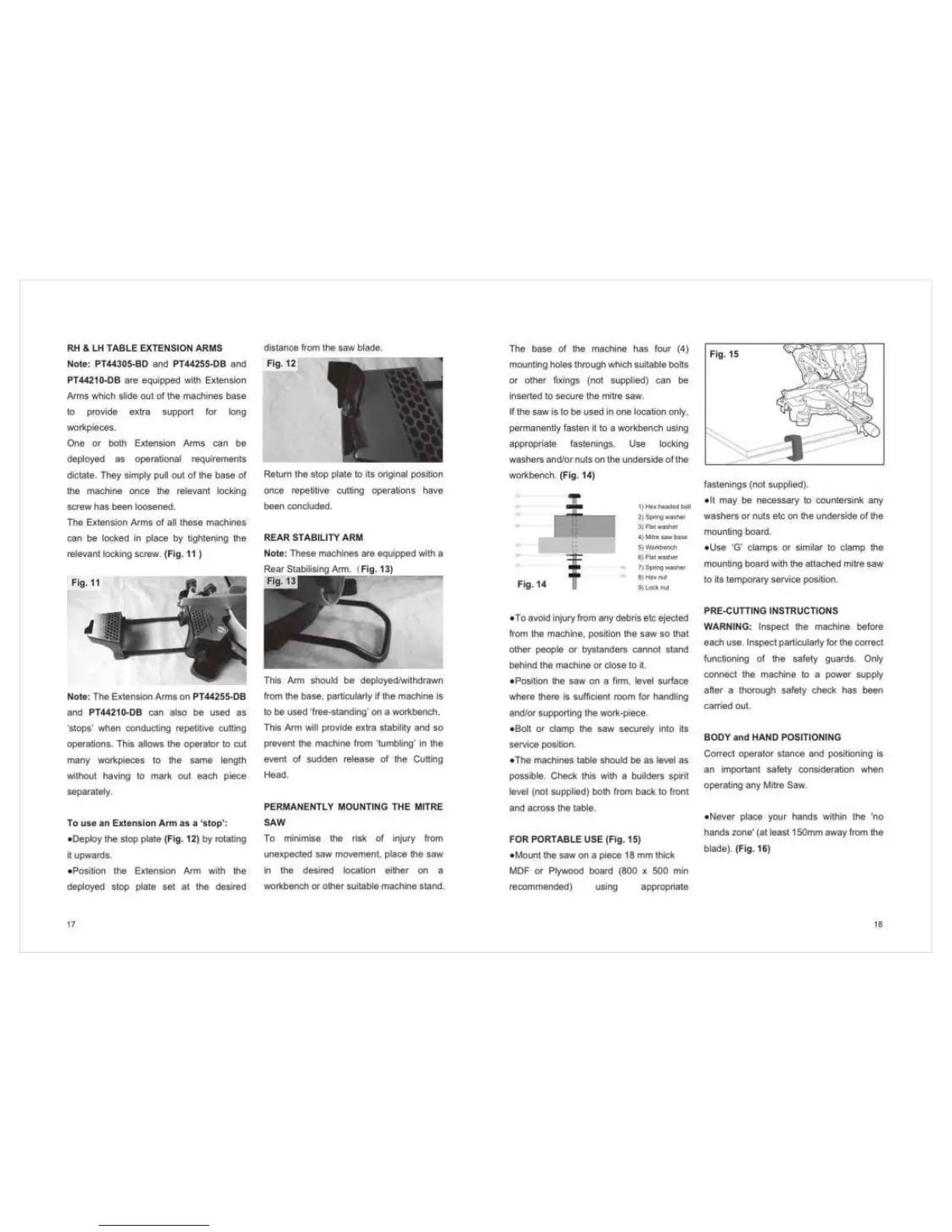 Pingtek PT44210-DB - Rear Stability Arm; Permanently Mounting the Mitre Saw; Pre-Cutting Instructions; Body and Hand Positioning