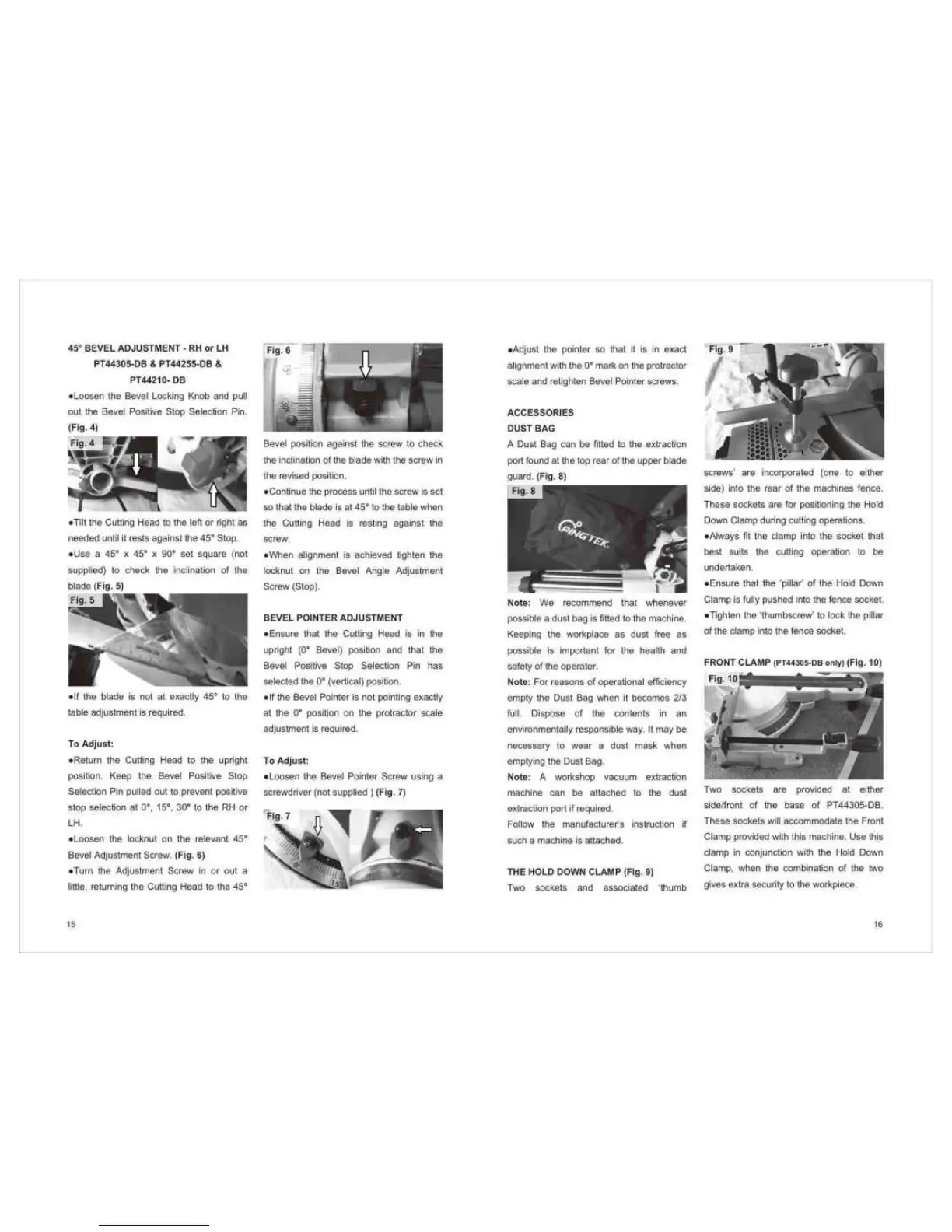 Pingtek PT44210-DB - 45 Degree Bevel Adjustment; Bevel Pointer Adjustment; Accessories; Dust Bag;The Hold down Clamp;Front Clamp