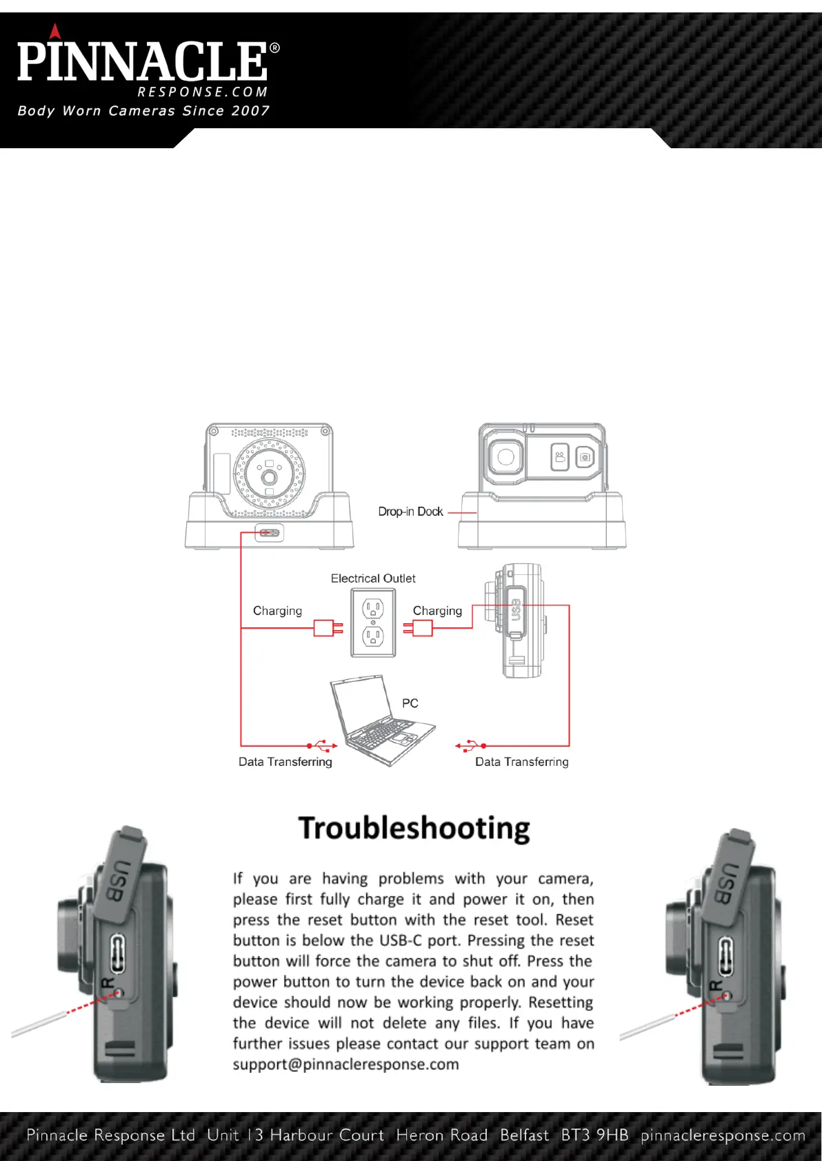 The camera can be charged via USB, single dock or a multi dock. The camera can charge