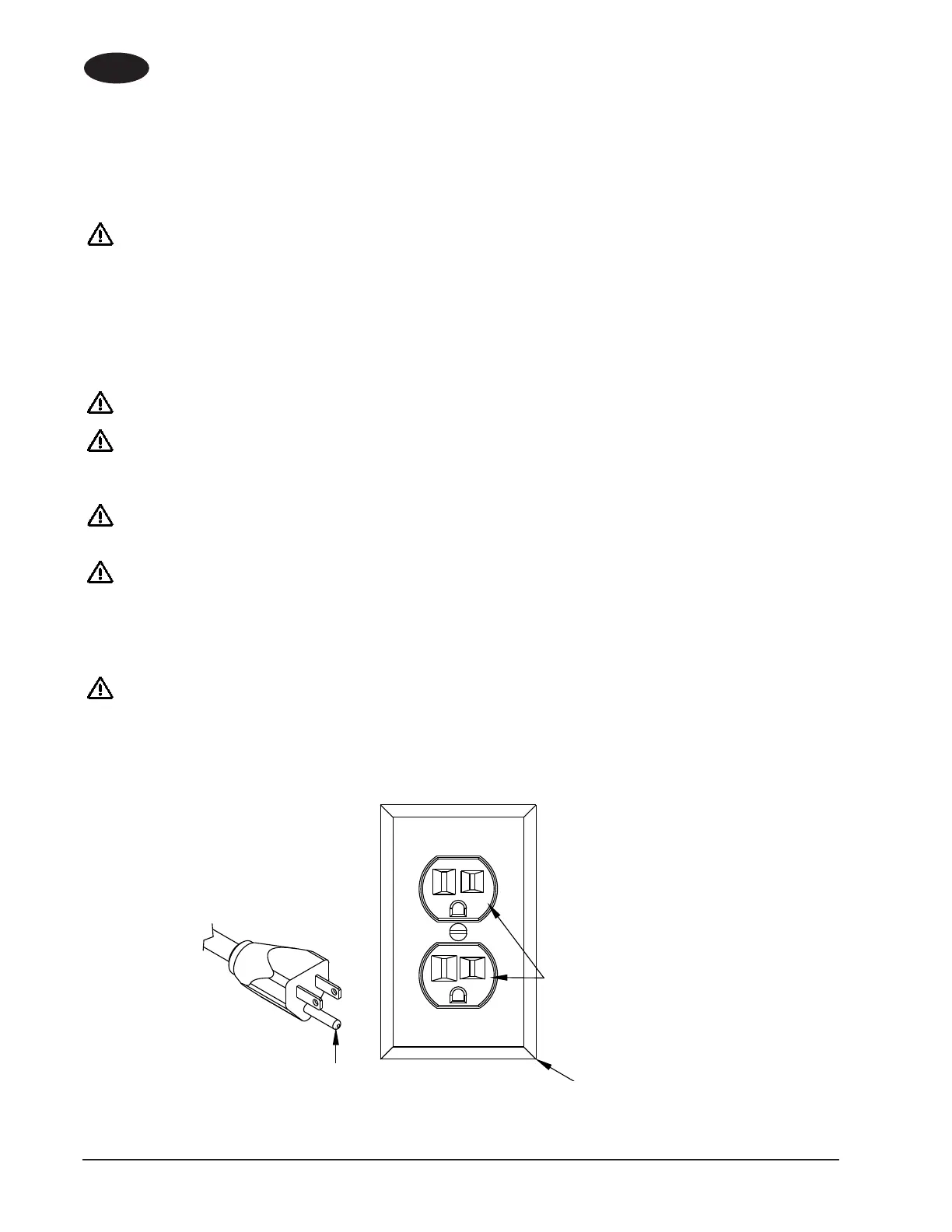 WARNING: Do not cut, remove or break the ground pin. If the outlet does not t the plug, consult your electrical