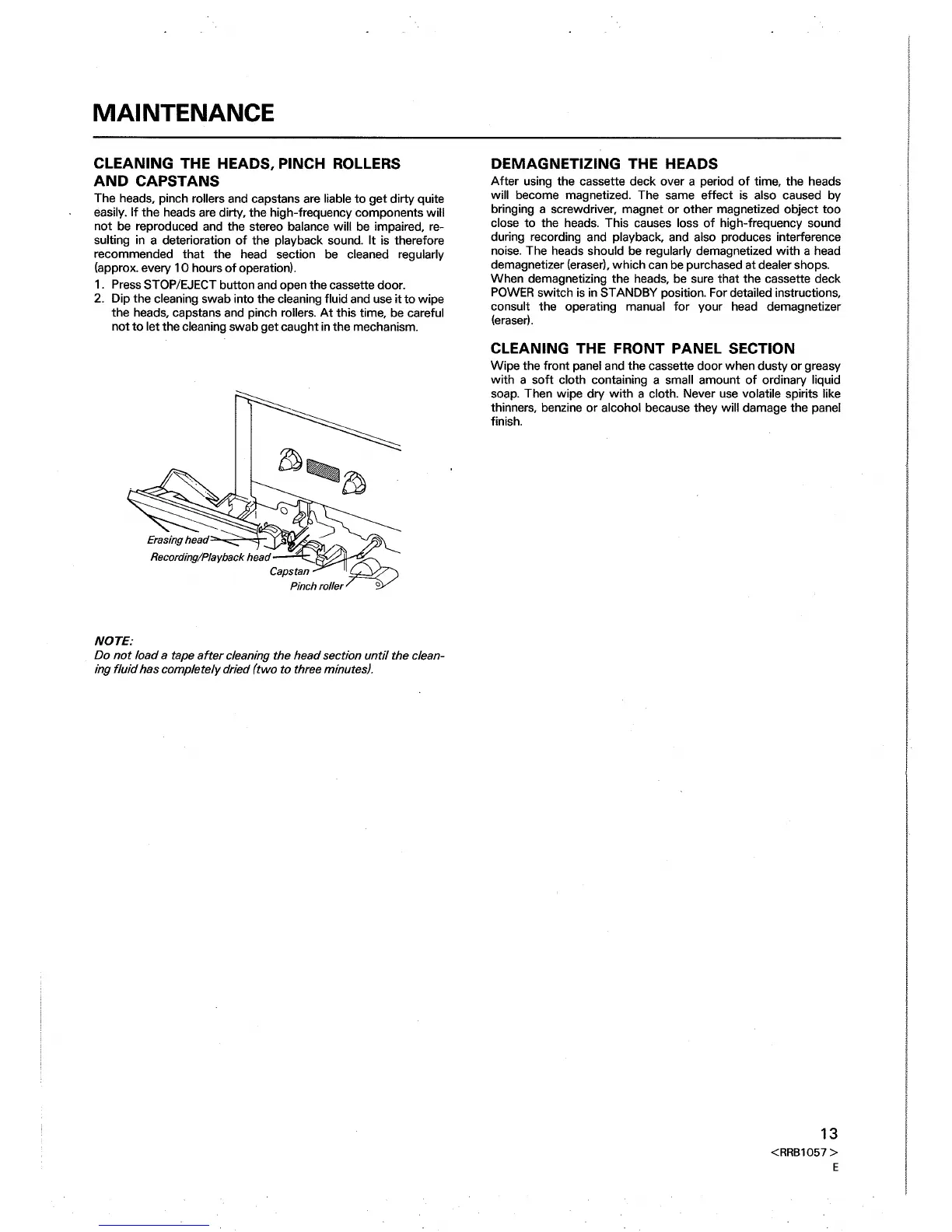 Pioneer CT-W430 - Maintenance; Cleaning the Heads, Pinch Rollers and Capstans; Demagnetizing the Heads; Cleaning the Front Panel Section