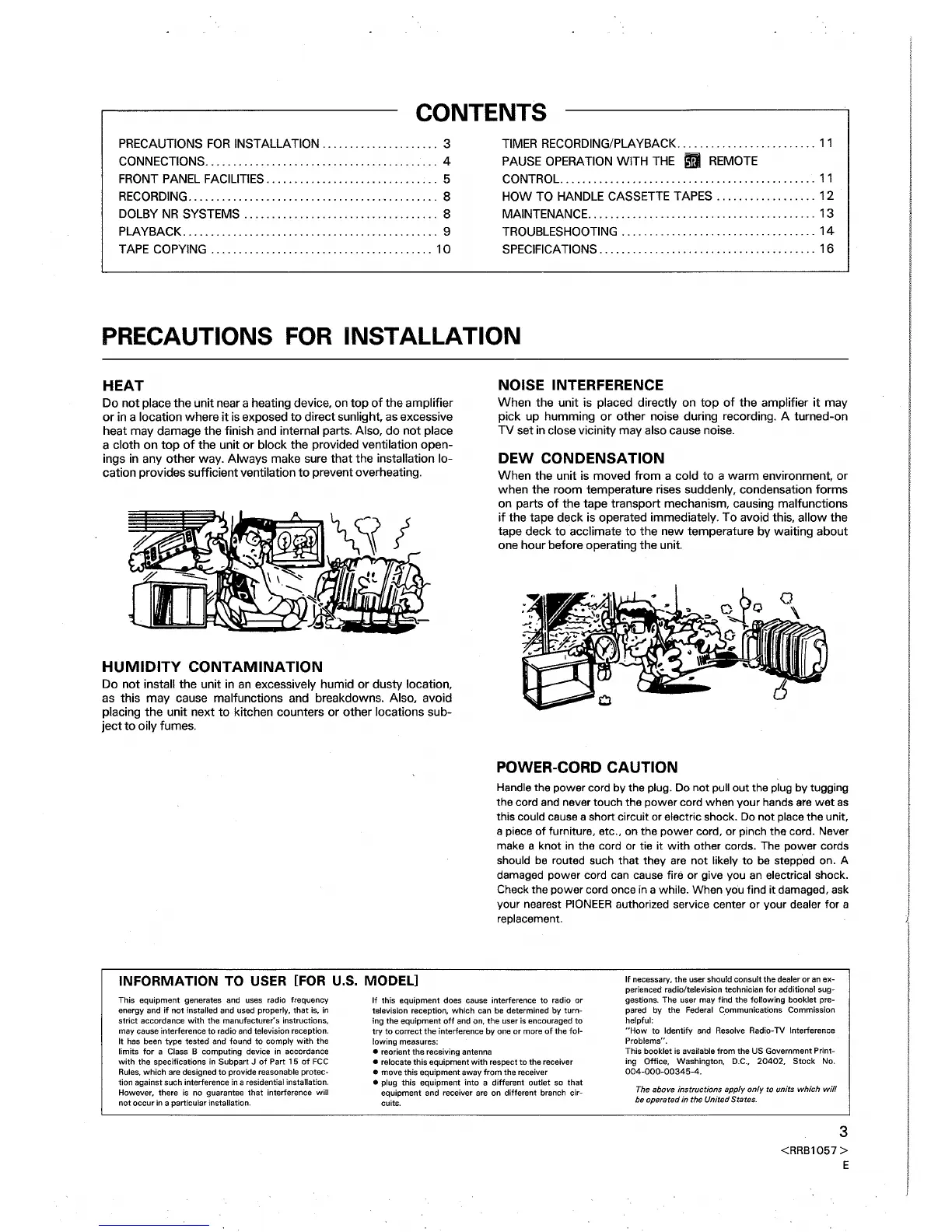 Pioneer CT-W430 - PRECAUTIONS FOR INSTALLATION; Heat and Environment Precautions