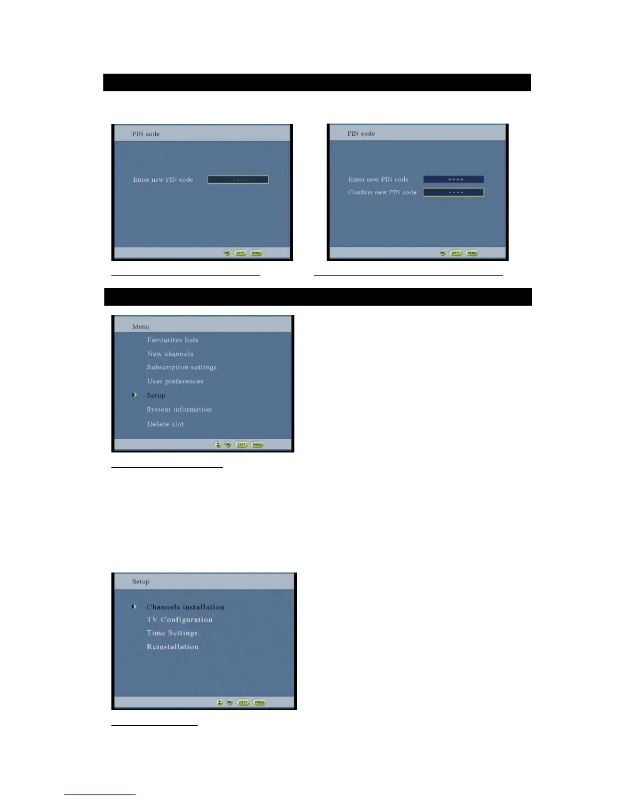 This menu offers access to the “Channels installation” menu, to “TV configuration” screen, to “Time setting” screen