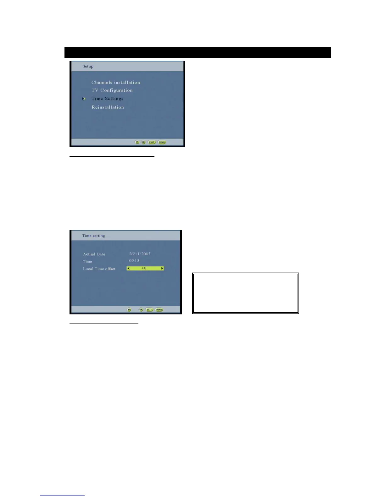 This screen allows to the end-user to set the local time and receive the worldwide universal time. The current date of