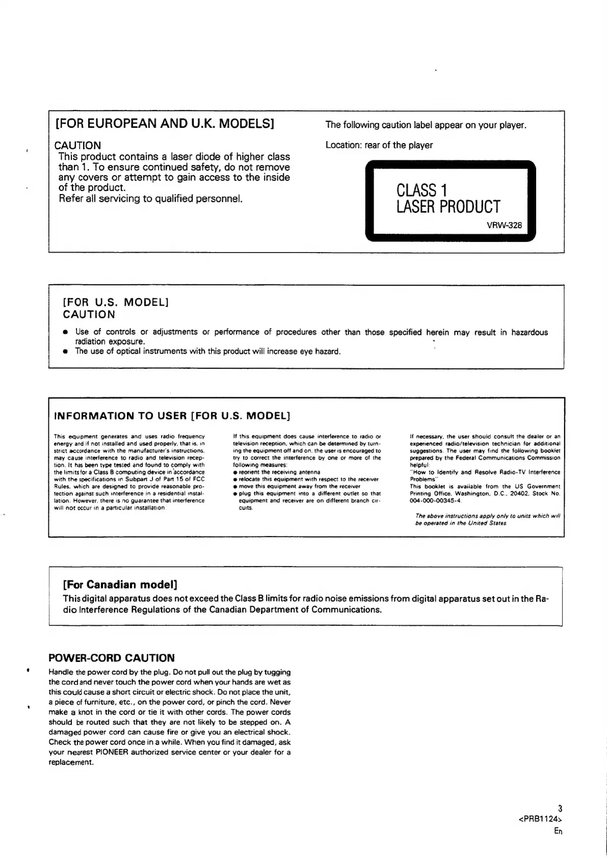 Pioneer PD-M430 - Model-Specific Safety and Compliance; European;U.K. Laser Safety; U.S. Model Radiation Hazard; FCC Interference Guidelines (U.S.)