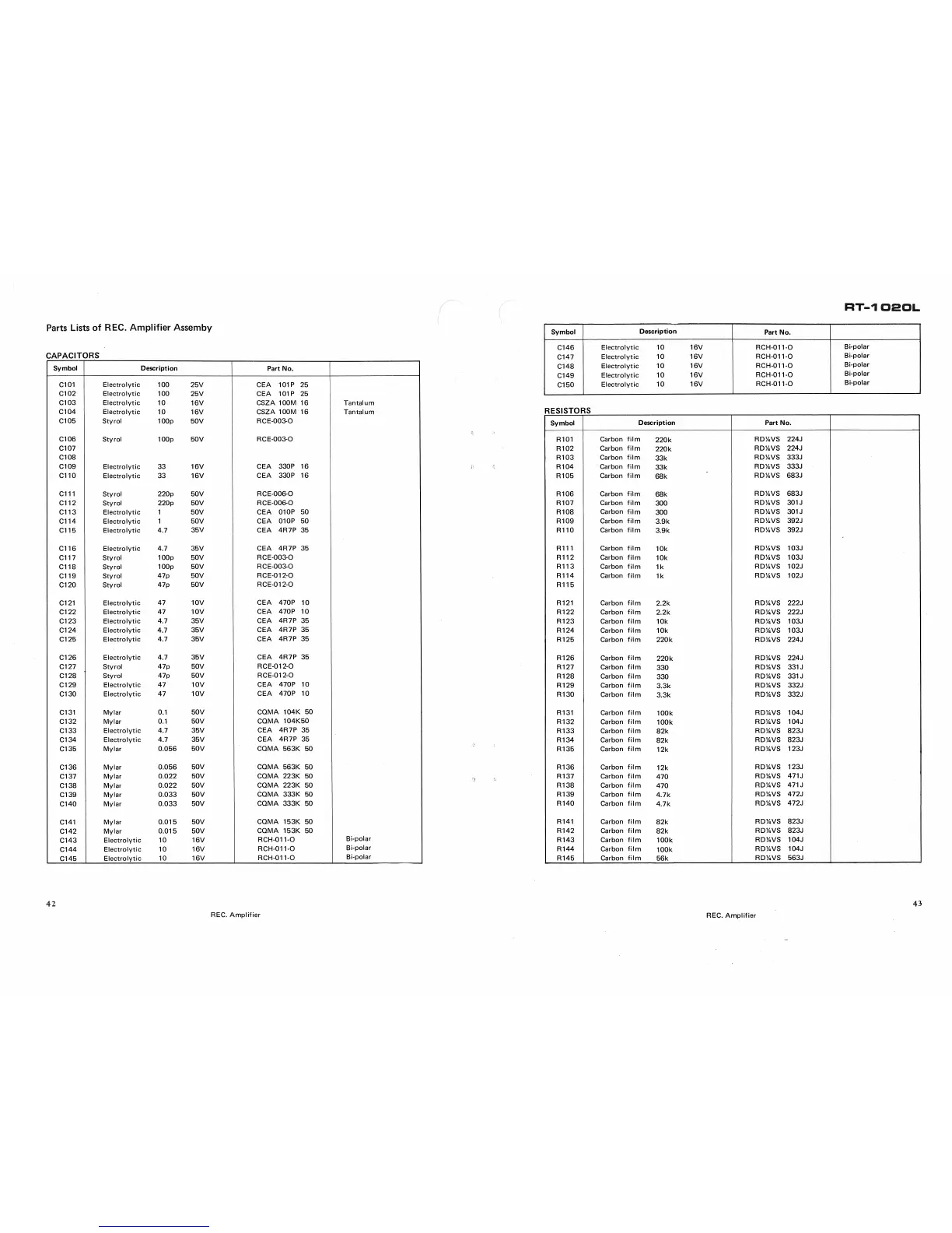 Pioneer RT-1020L - Part Lists of REC Amplifier Assembly