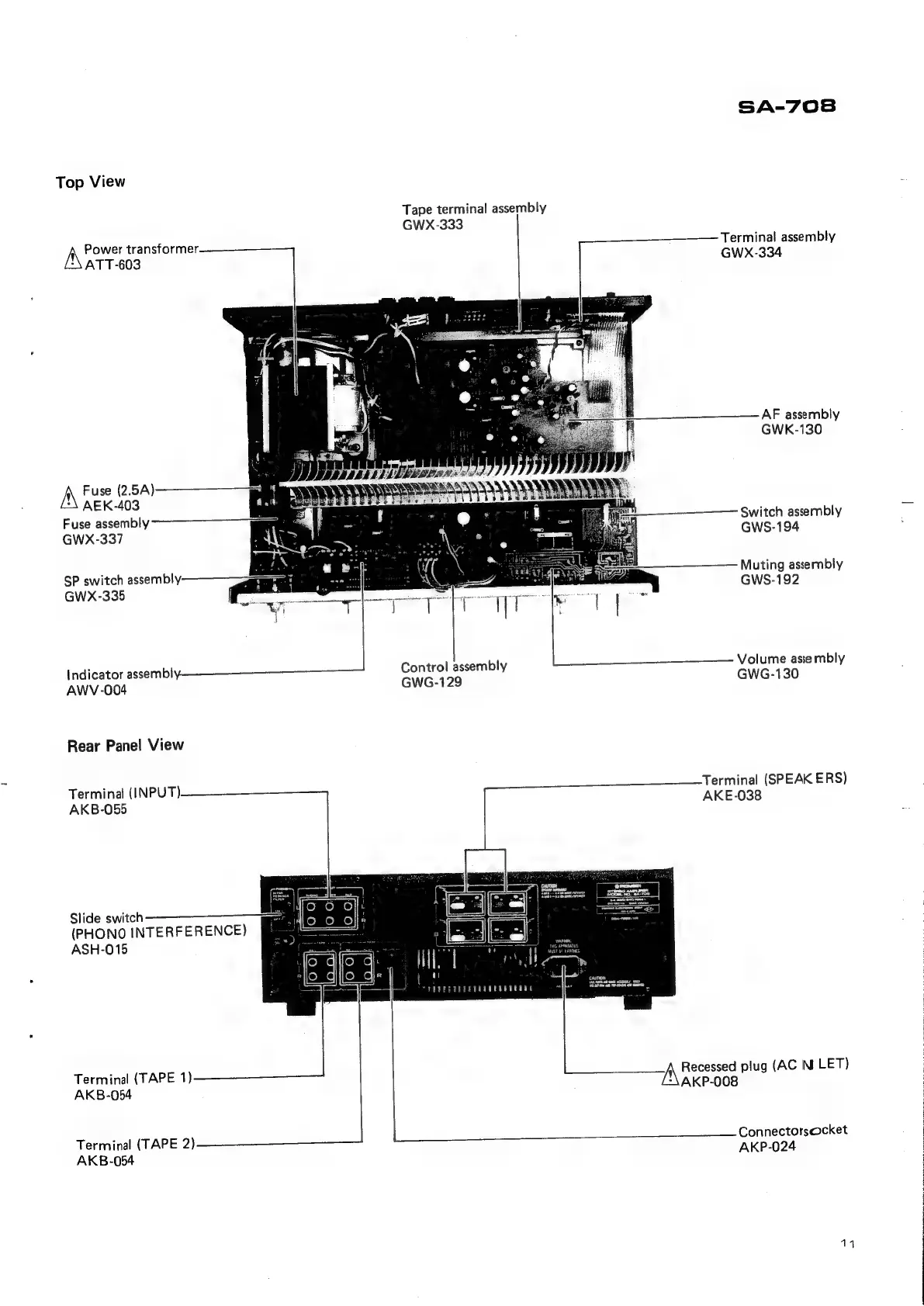 Pioneer SA-708 - Internal & Rear Panel Parts Location; Top View Parts; Rear Panel Views