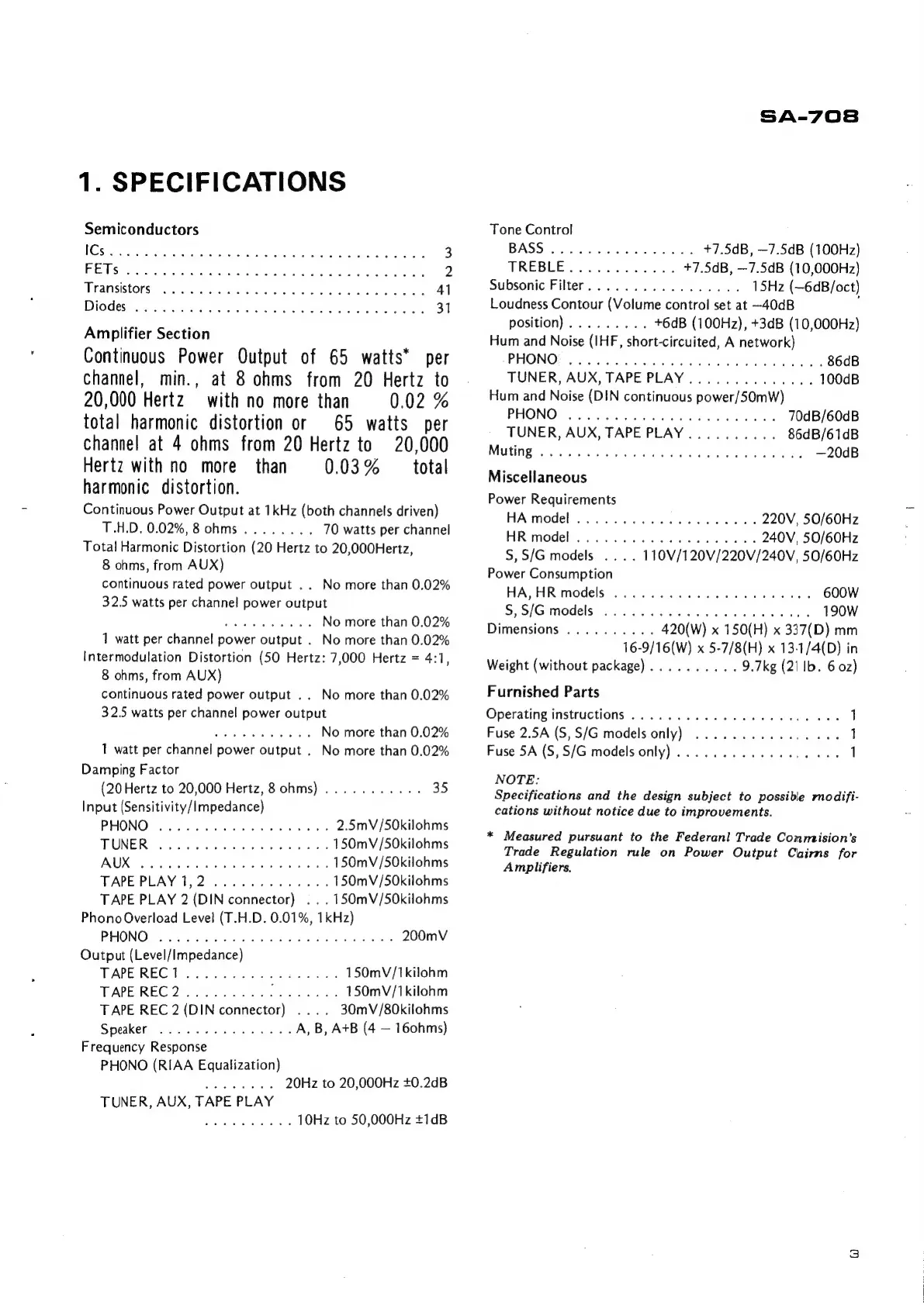 Pioneer SA-708 - Specifications; Semiconductors; Amplifier Performance; Tone, Filter & Loudness Specs