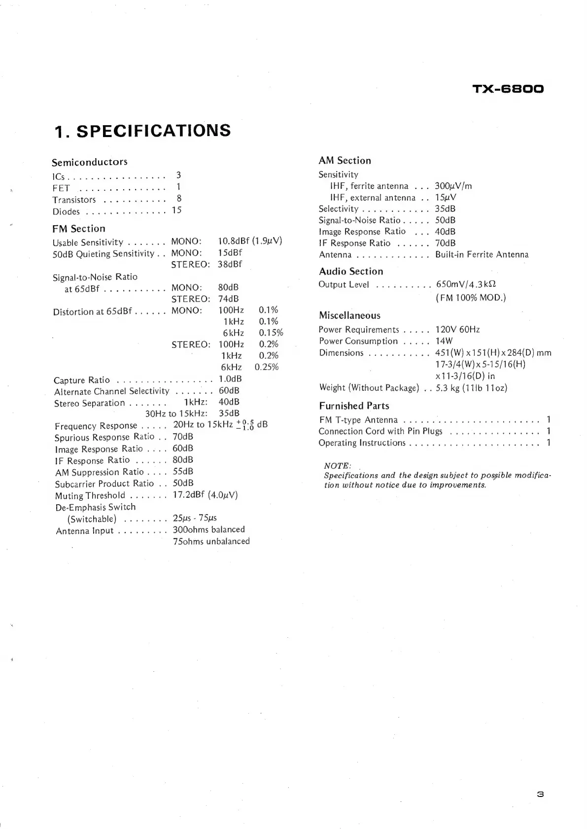 Pioneer TX-608 - Specifications Overview; Semiconductor Components; FM Section Specifications; AM Section Specifications