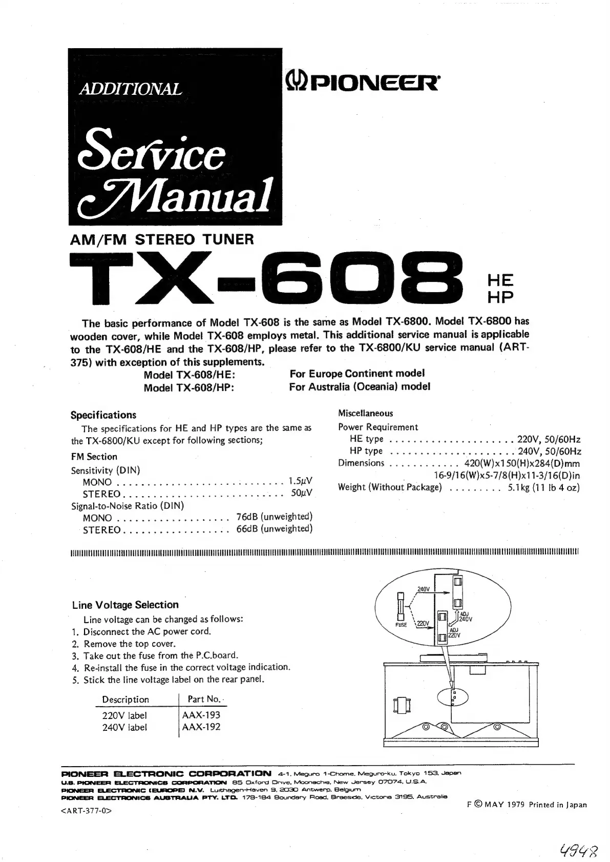 Pioneer TX-608 - Additional Manual: Specifications; FM Section (Additional Models); Miscellaneous (Additional Models); Additional Manual: Line Voltage Selection