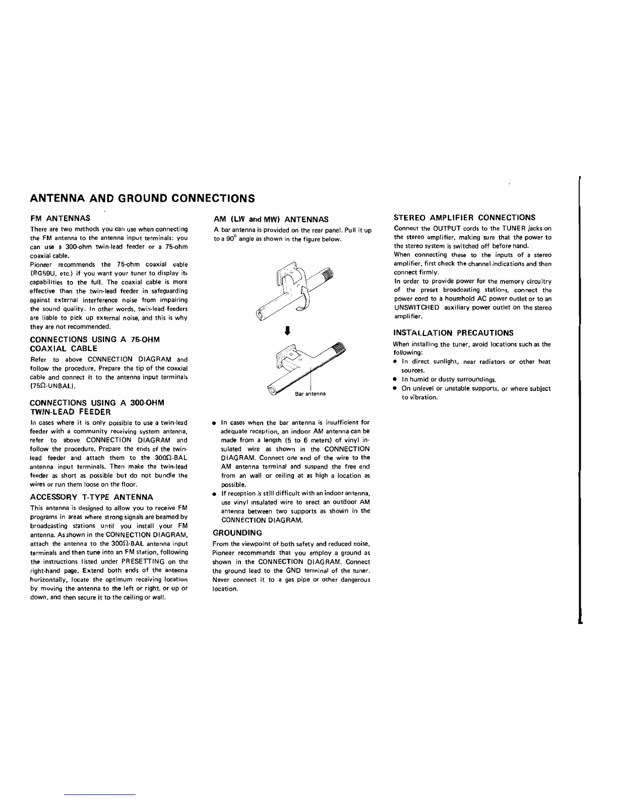 Pioneer TX-710L - Pioneer TX-710 L Antenna and Grounding; FM Antenna Connection Methods; 75-ohm Coaxial Cable Antenna Connection; 300-ohm Twin-lead Feeder Antenna Connection