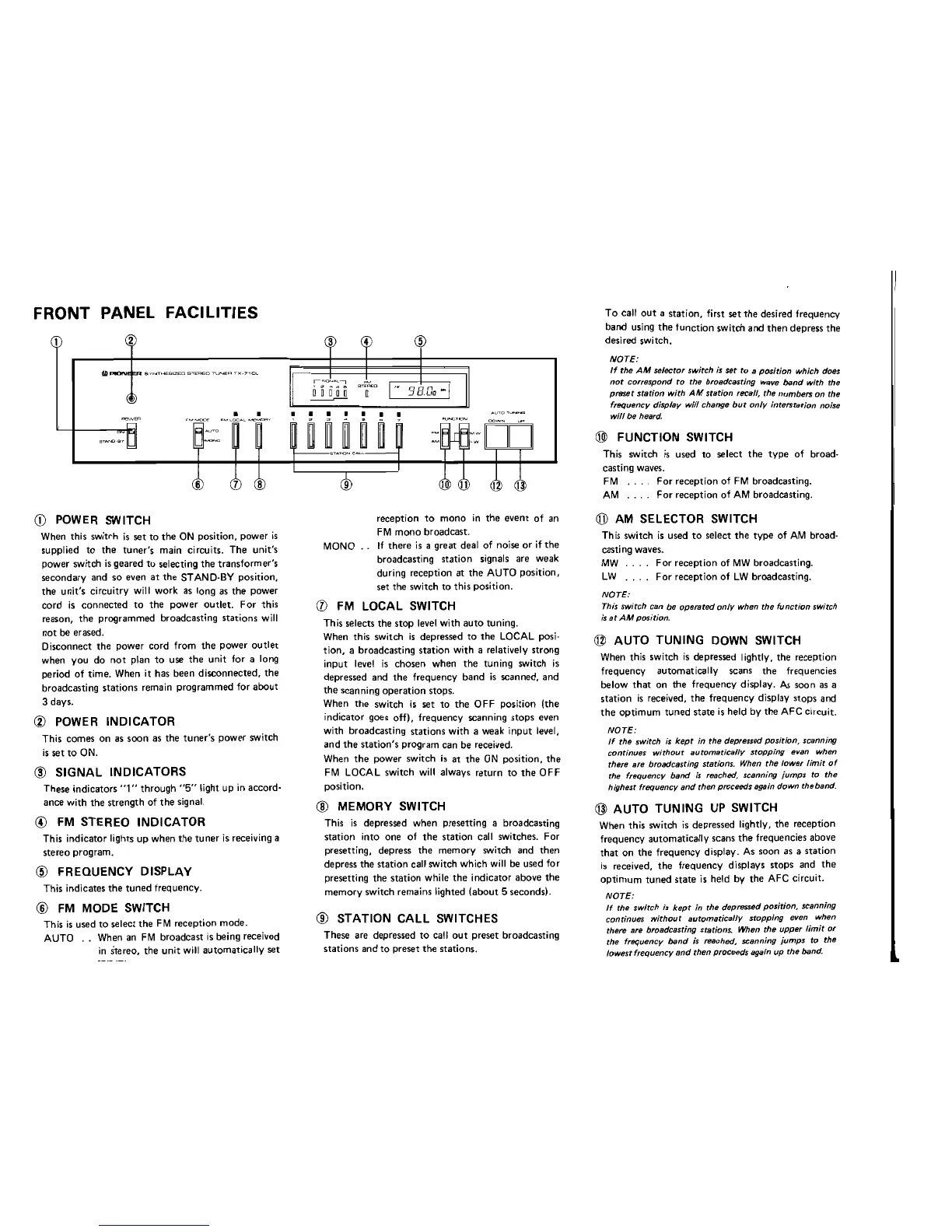 Pioneer TX-710L - Pioneer TX-710 L Front Panel Controls and Facilities; Power Switch and Indicator; Signal and Display Indicators; FM Reception Controls