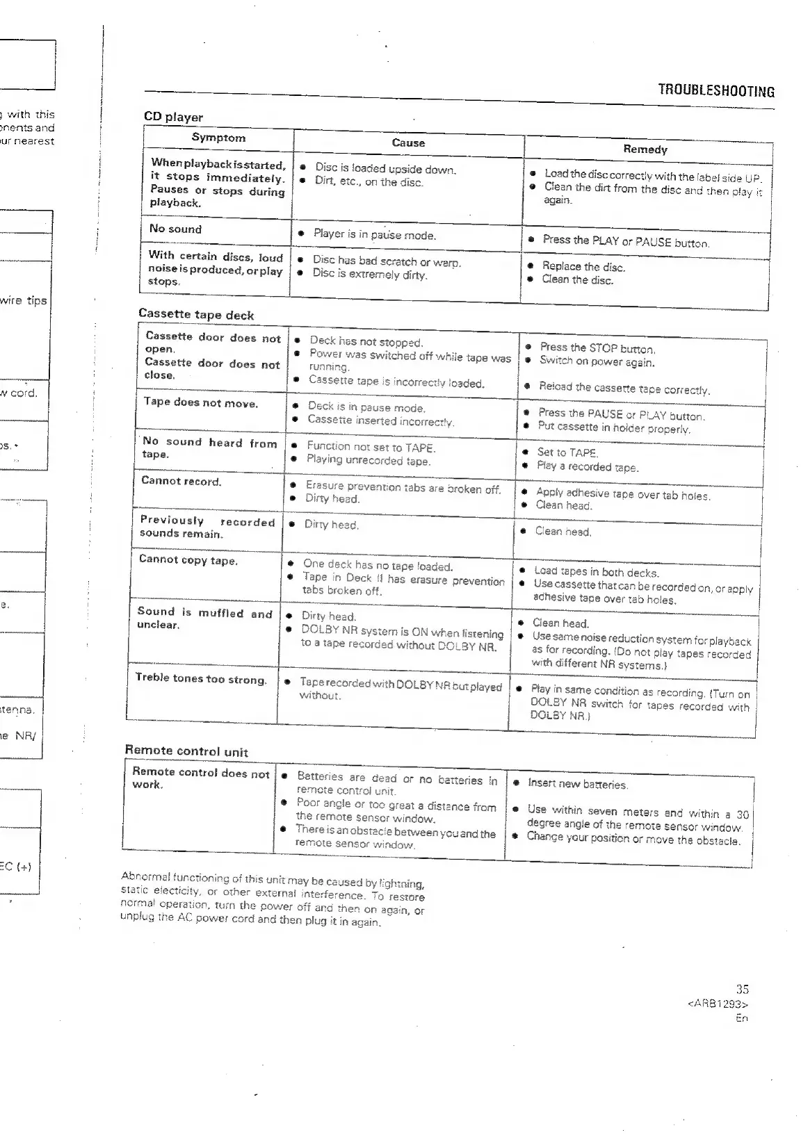 Pioneer XR-P310 - TROUBLESHOOTING (Components); CD Player and Cassette Deck Issues; Remote Control Malfunctions