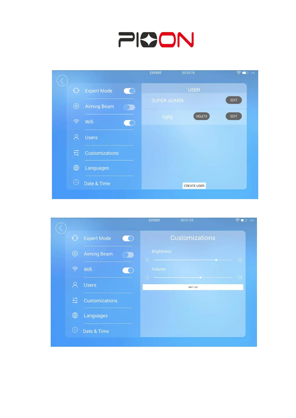 E. Customizations: Set brightness, sound size and unit interface. (Figure 33)