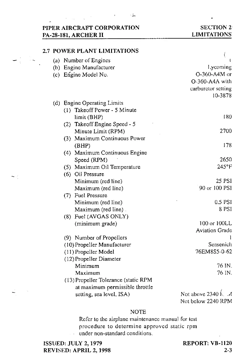 Piper ARCHER II - Power Plant Limitations