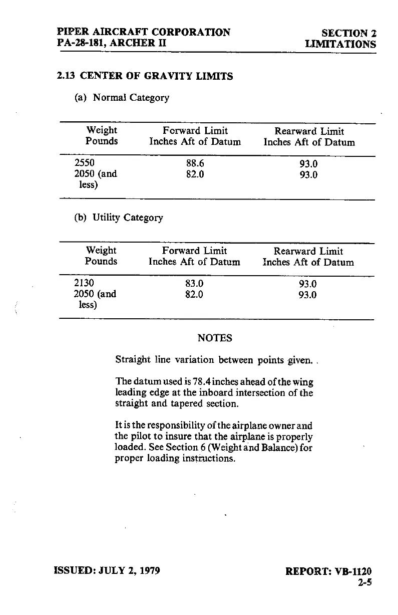 Piper ARCHER II - Center of Gravity Limits