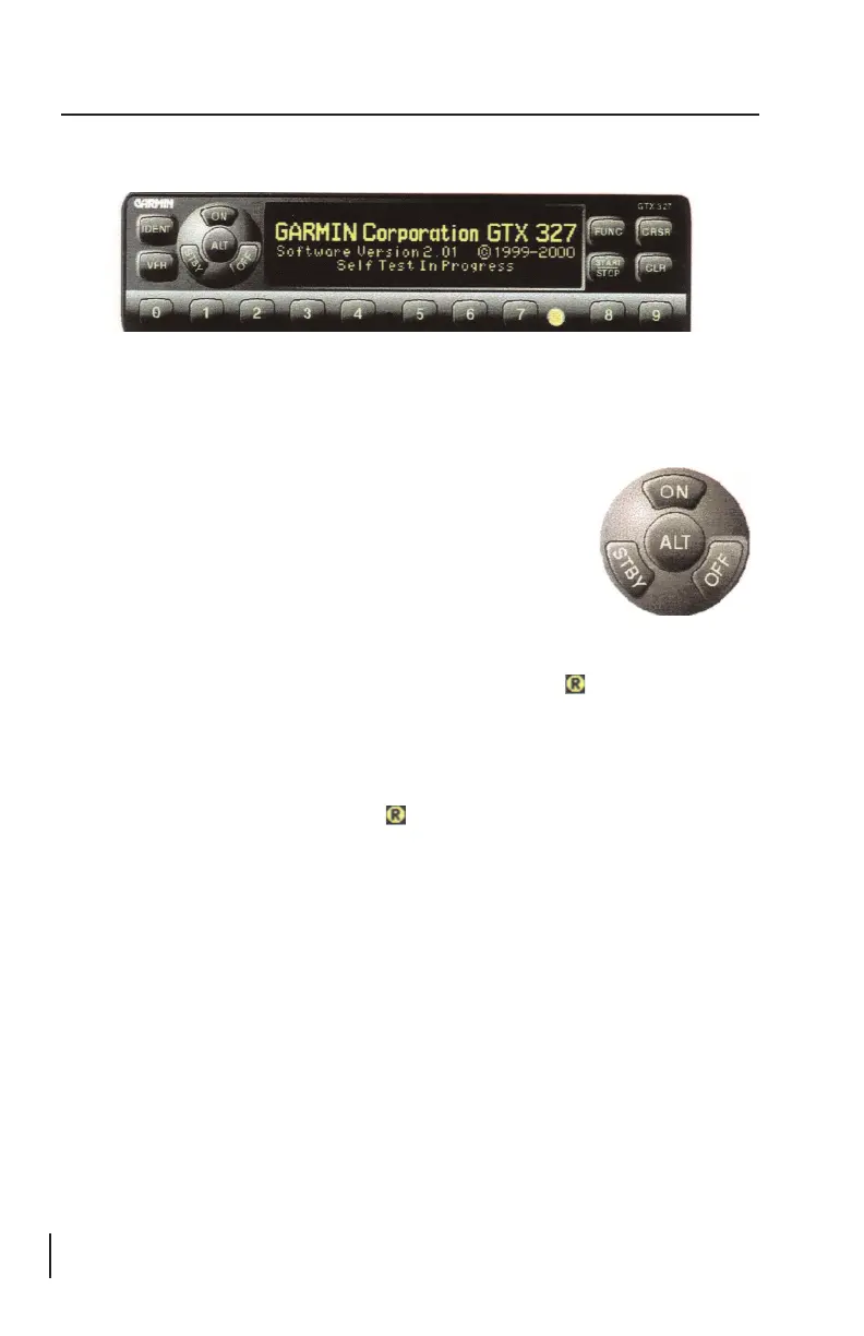 The GTX 327 transponder is powered on by pressing the STBY, ALT or ON