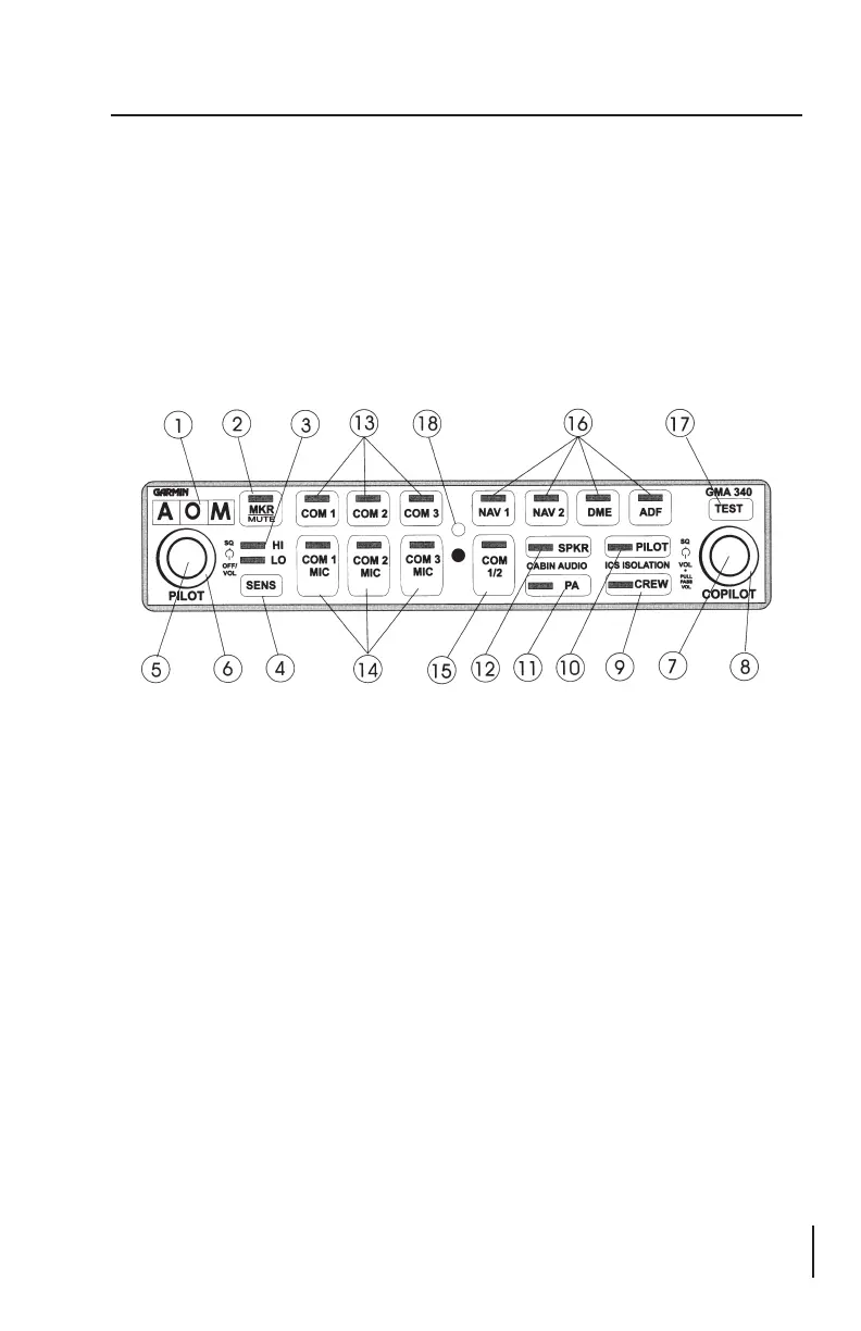 13. Transceiver Audio Selector Buttons (COM1, COM2, COM3)