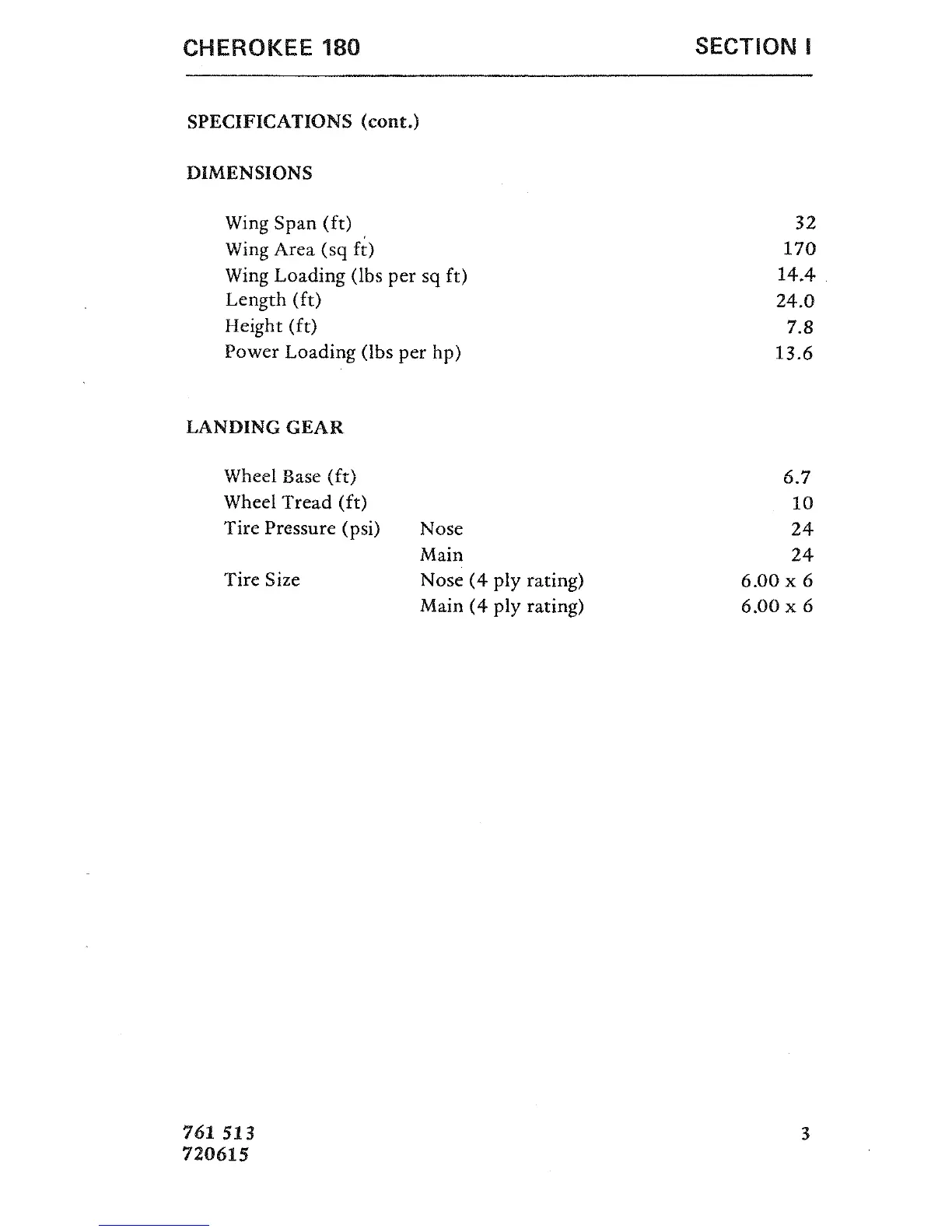 Piper CHEROKEE 180 - Aircraft Dimensions; Landing Gear Specifications