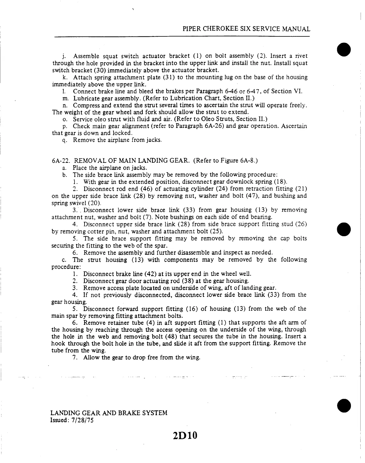 6A-22. REMOVAL OF MAIN LANDING GEAR. (Refer to Figure 6A-8.)