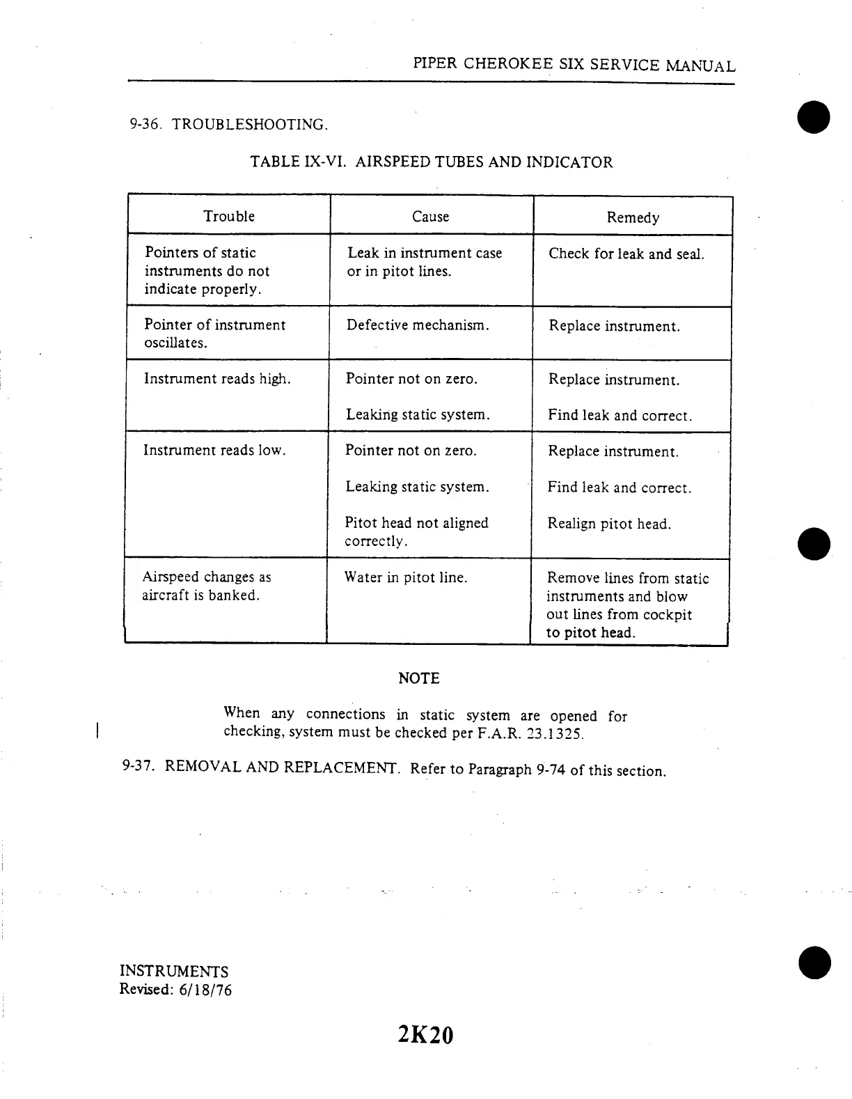 Piper Cherokee Six - Airspeed Tubes and Indicator; Troubleshooting