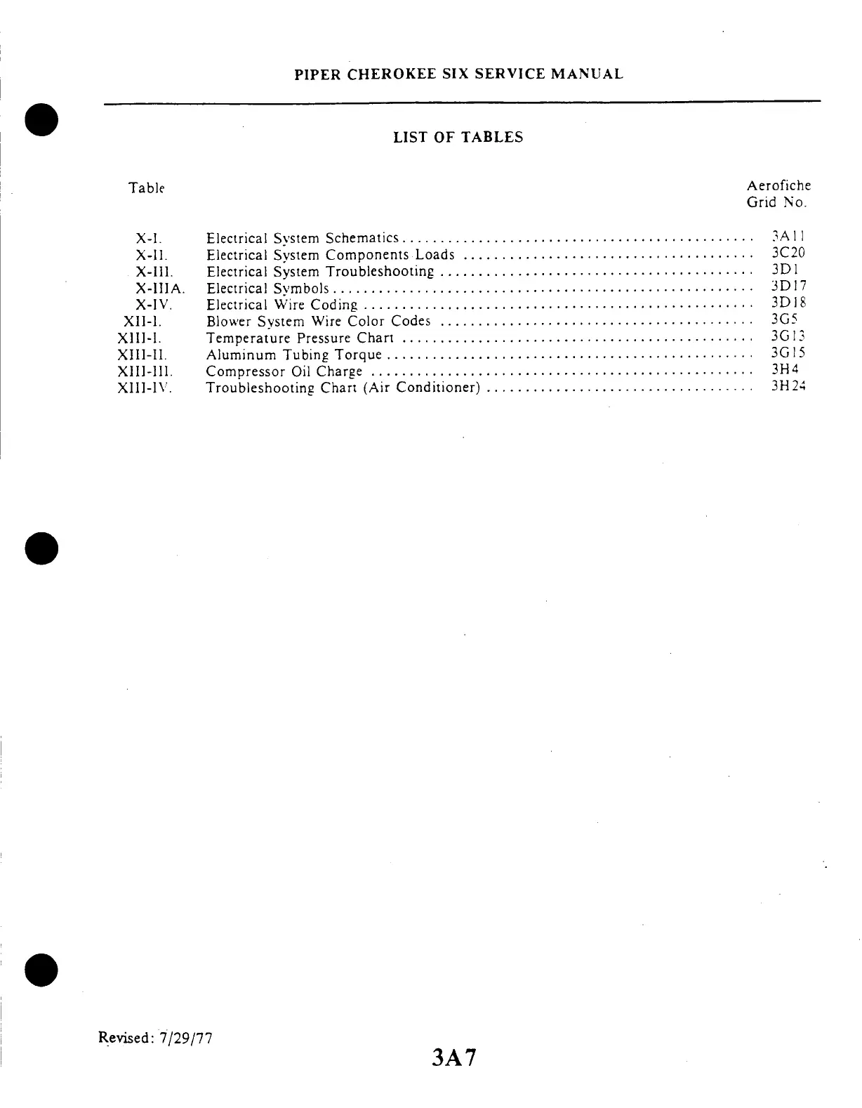 Piper Cherokee Six - Table Aerofiche; Electrical System Schematics; Electrical System Components Loads; Aluminum Tubing Torque