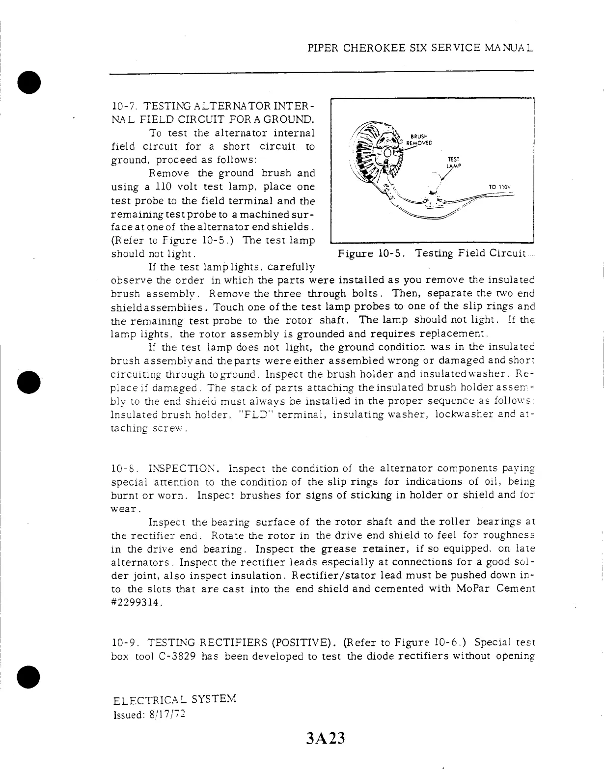Piper Cherokee Six - Testing Alternator Internal Field Circuit for a Ground; Inspection; Testing Rectifiers (Positive)