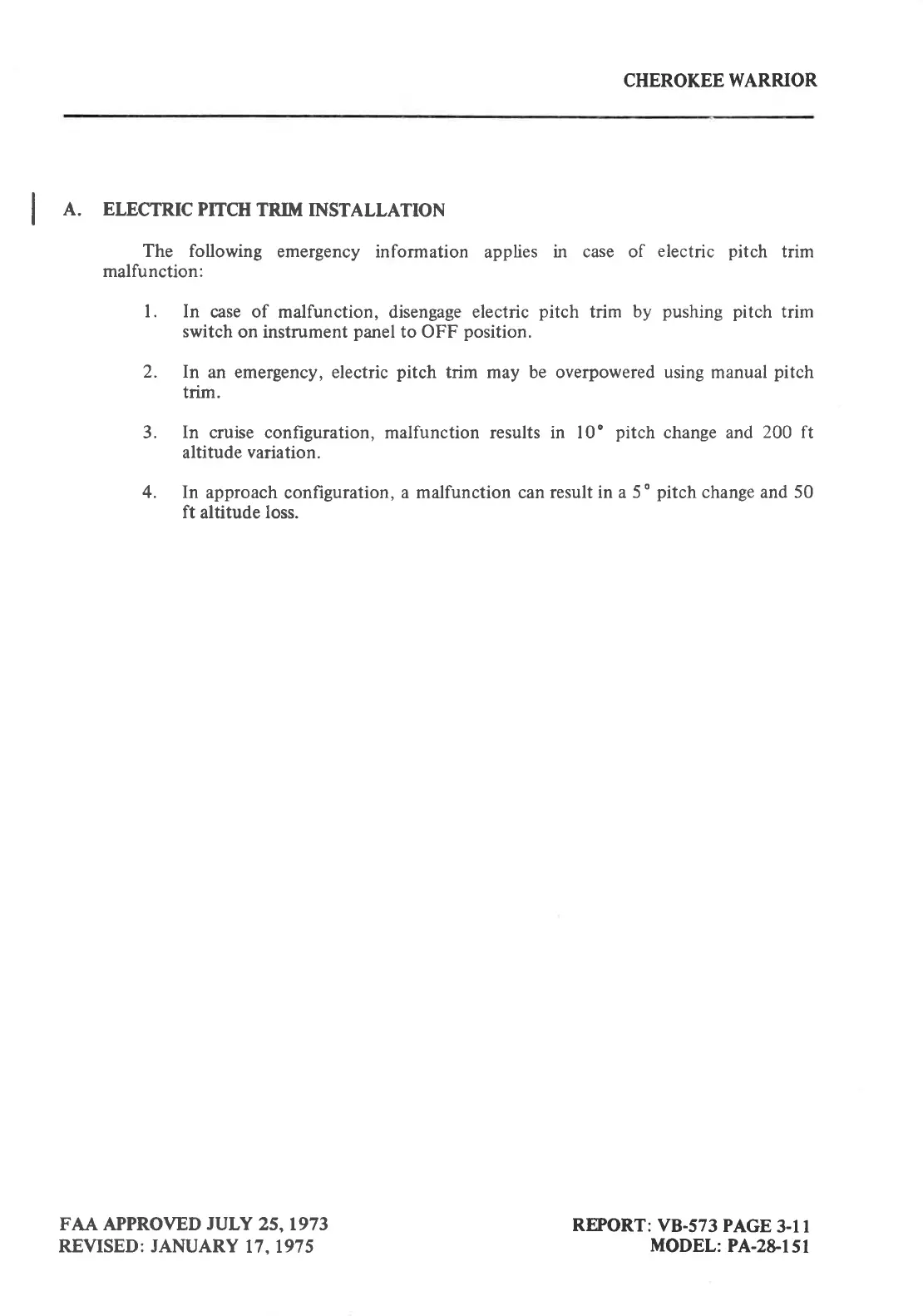 Piper cherokee WARRIOR - ELECTRIC PITCH TRIM INSTALLATION; Emergency Malfunction Procedures