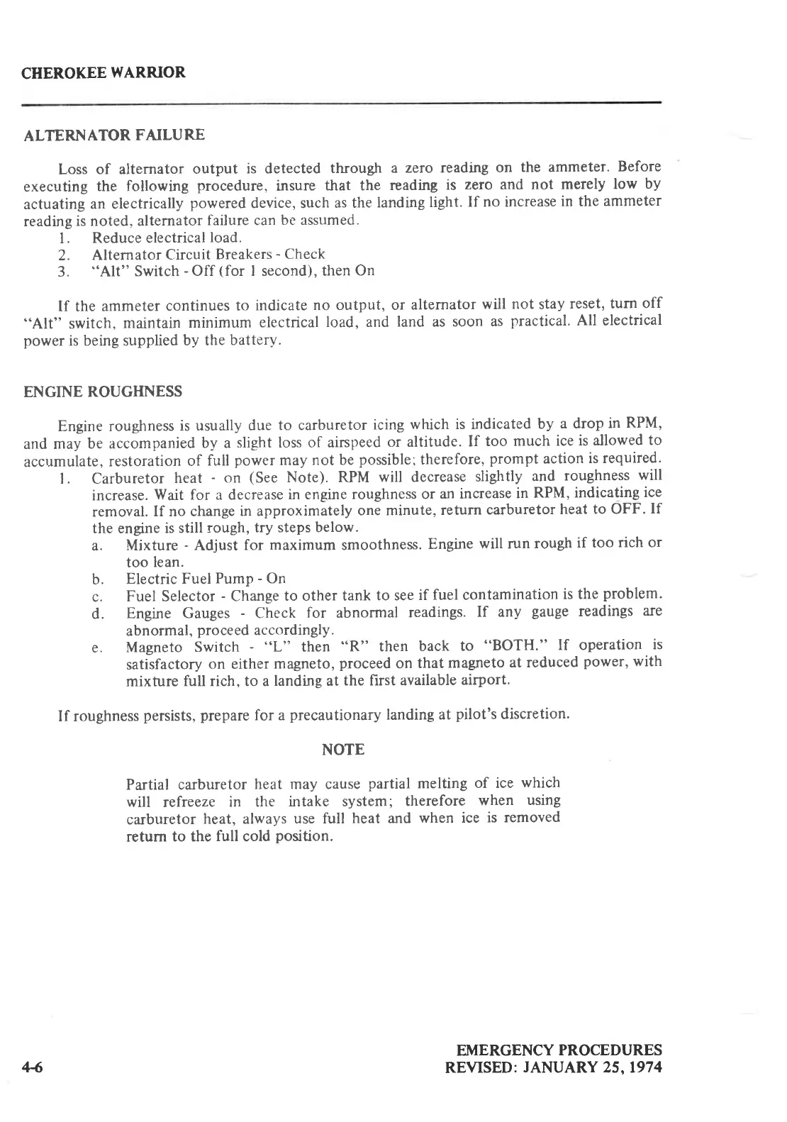 Piper cherokee WARRIOR - SYSTEM FAILURE PROCEDURES; Alternator Failure and Engine Roughness