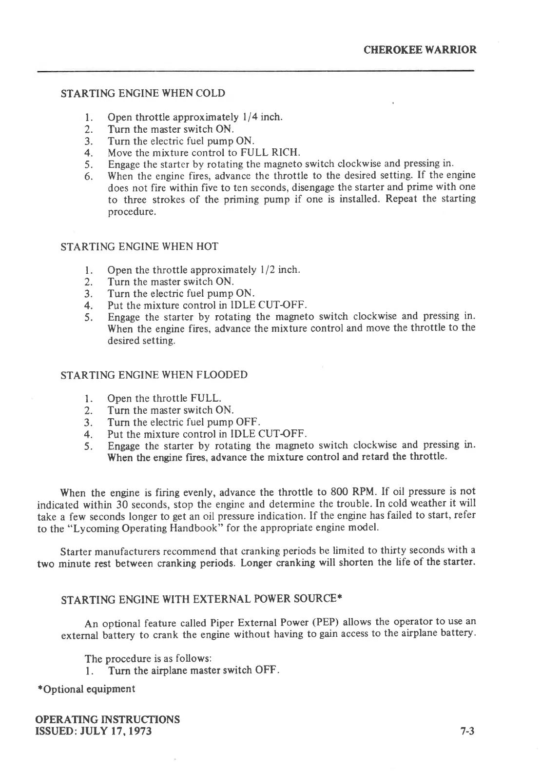 Piper cherokee WARRIOR - ENGINE STARTING PROCEDURES; Engine Start Methods