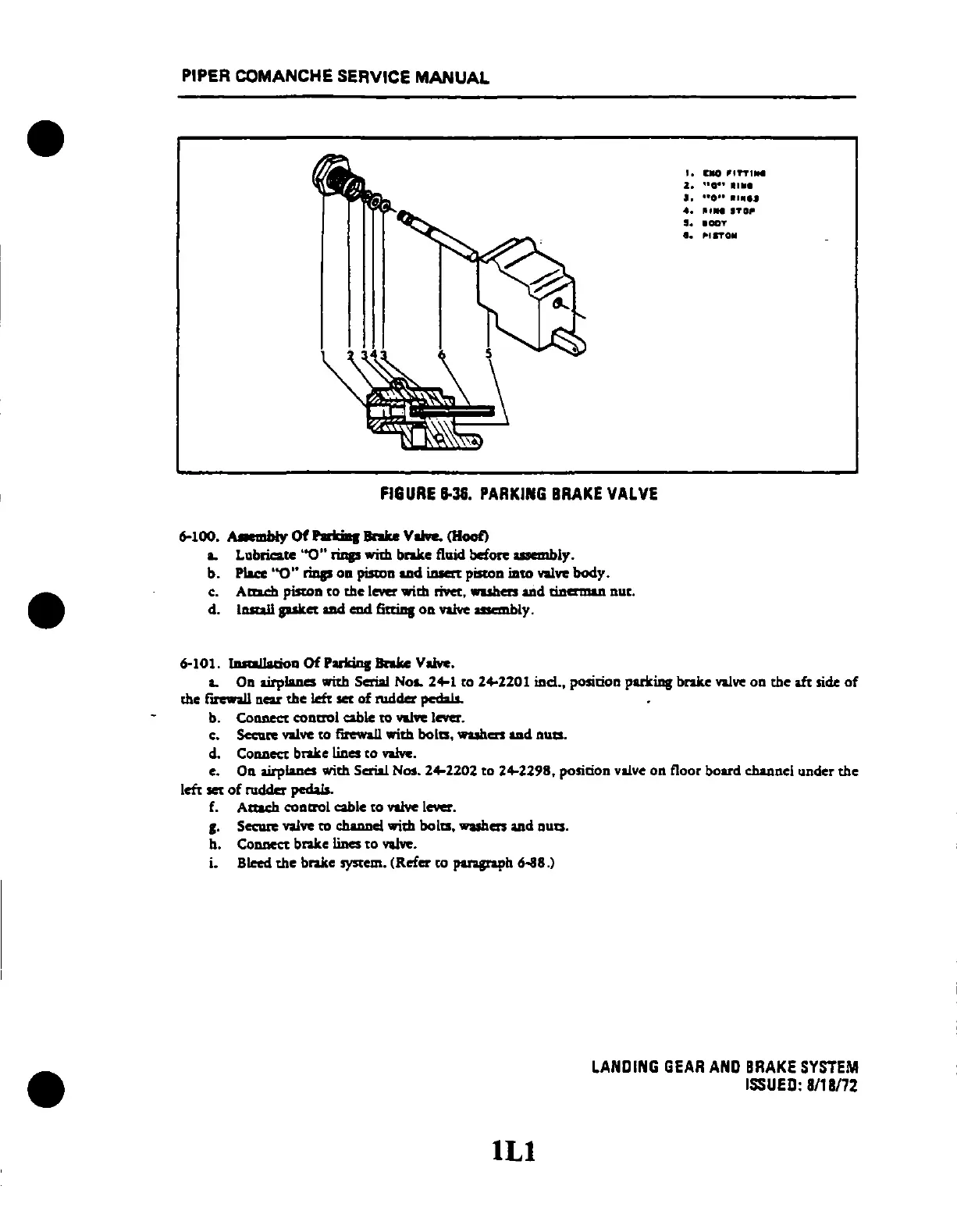 Piper Comanche PA-24 - FIGURE 6-36. PARKING BRAKE VALVE; 6-100. ASSEMBLY OF PARKING BRAKE VALVE (HOOF); 6-101. INSTALLATION OF PARKING BRAKE VALVE