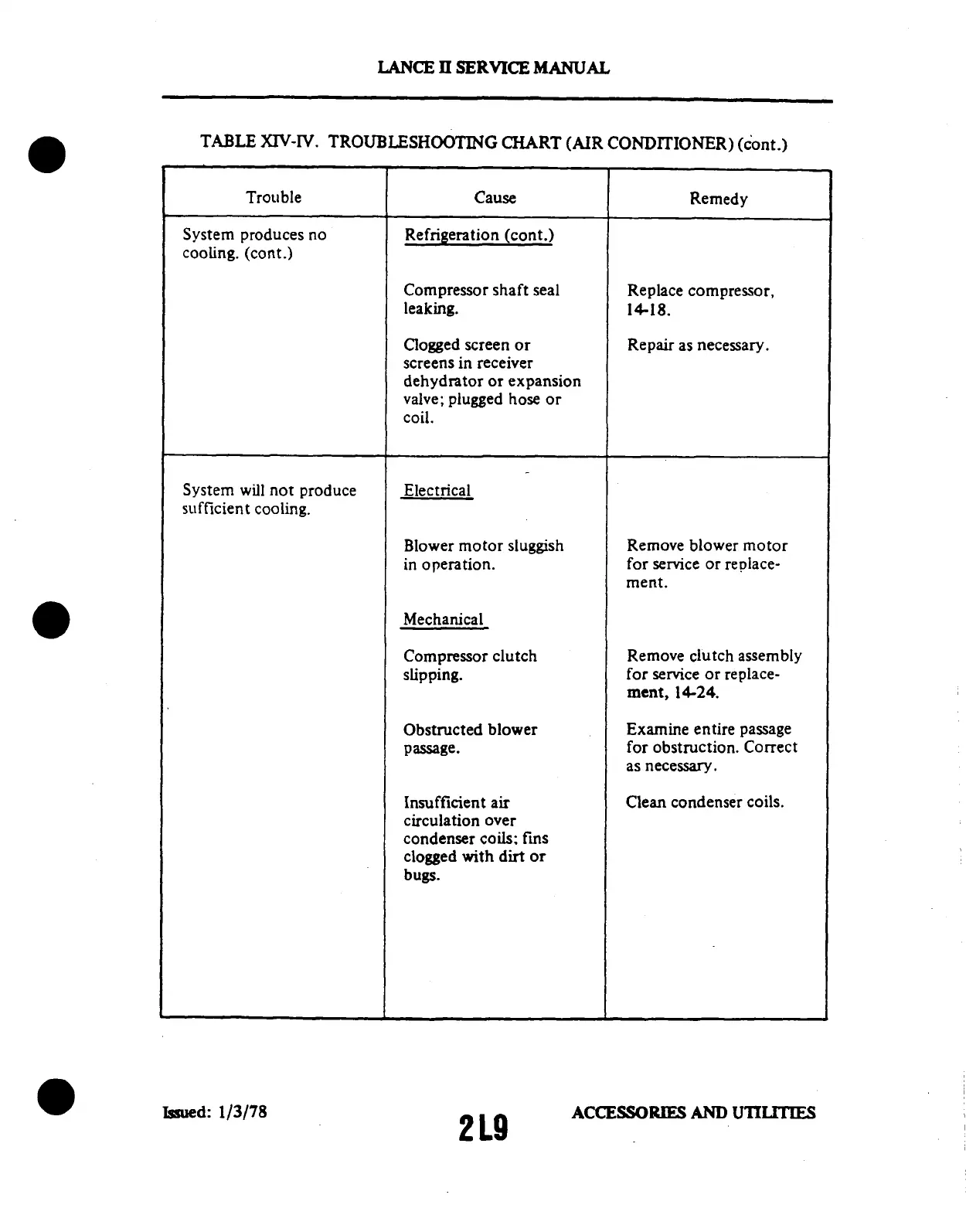 TABLE XIV-IV. TROUBLESHOOTING CHART (AIR CONDITIONER) (cont.)