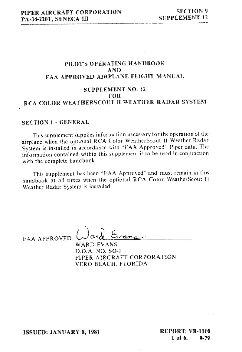 Piper SENECA III - Supplement No. 12 for RCA Color Weatherscout II Weather Radar System
