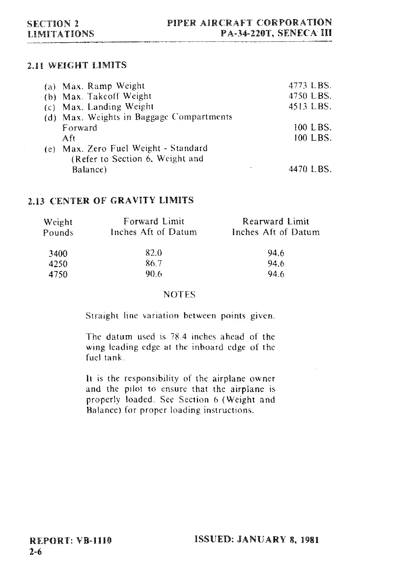 Piper SENECA III - Weight Limits; Center of Gravity Limits