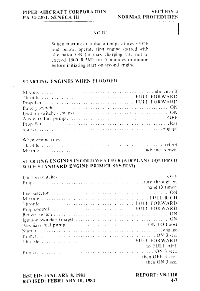 Piper SENECA III - Starting Engines When Flooded; Starting Engines in Cold Weather (Airplane Equipped with Standard Engine Primer System)