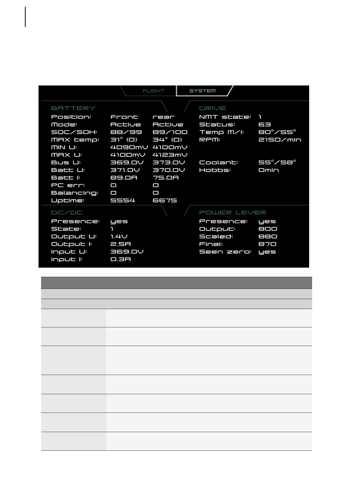 SYSTEM mode shows several diagnostic values of the system components. This mode is selected by