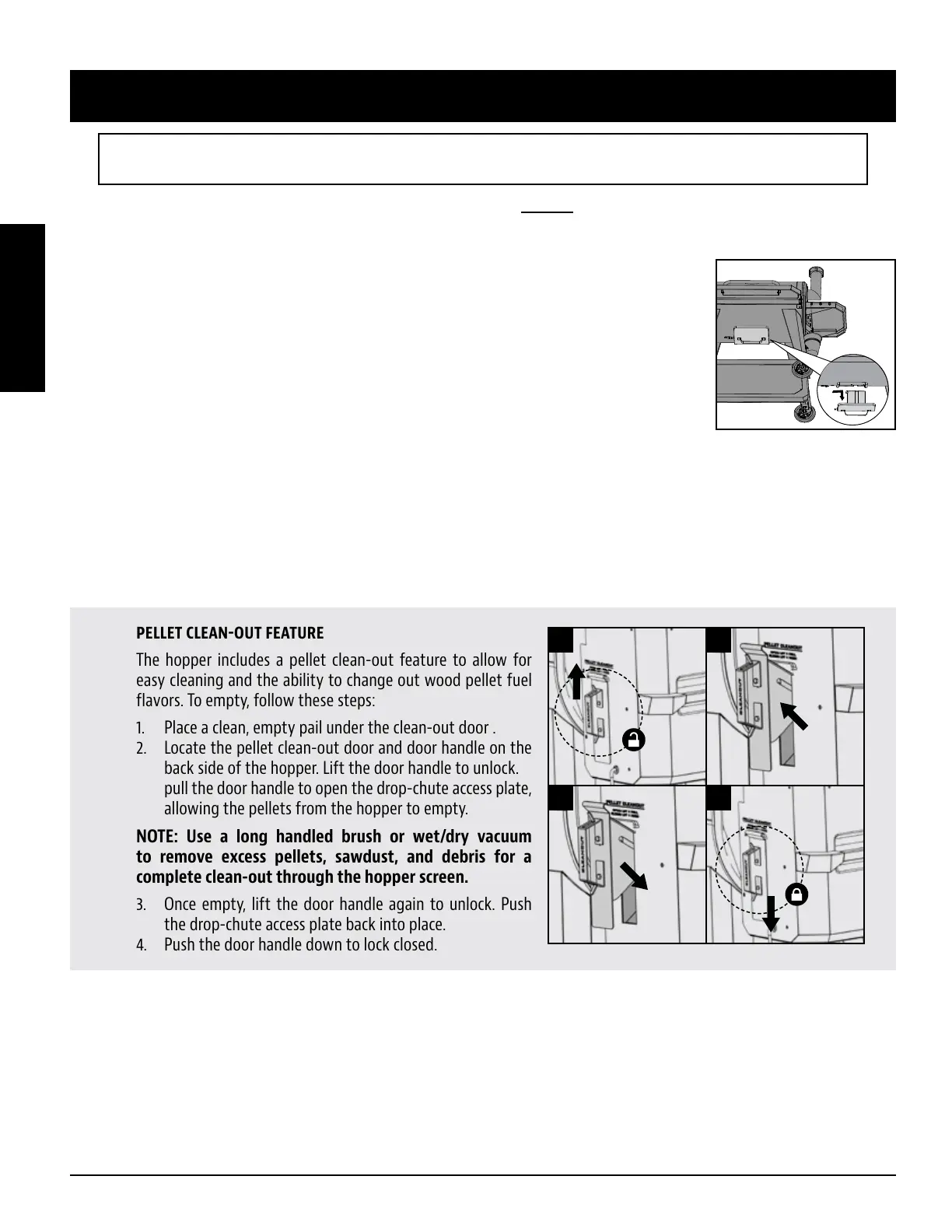 • Running all pellets out of your auger system is recommended if your grill will be unused for an extended period